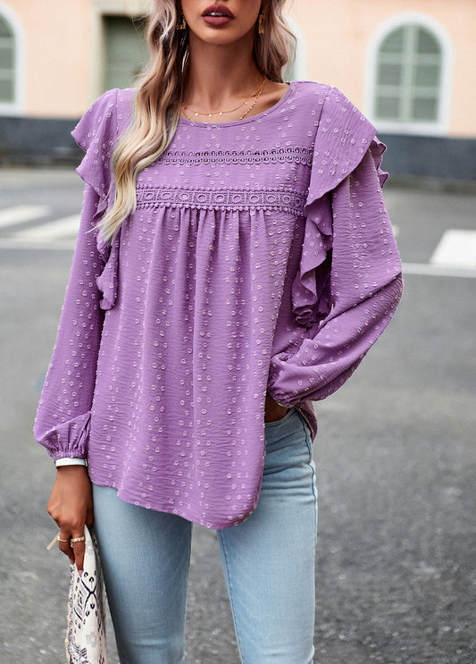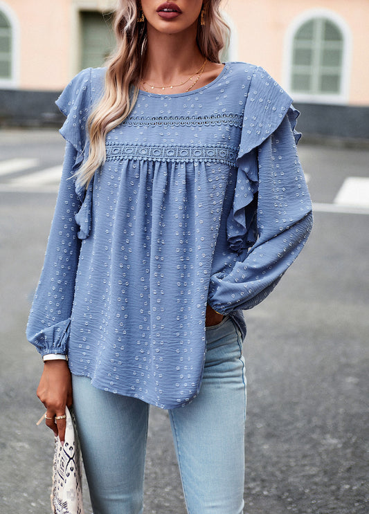 Dark Blue Textured Ruffled Sleeve Round Neck Top