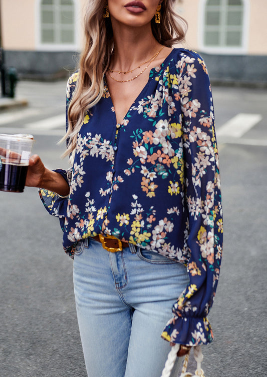 Sky Blue Floral Print Ruffle Sleeve Frilly Button Up Shirt