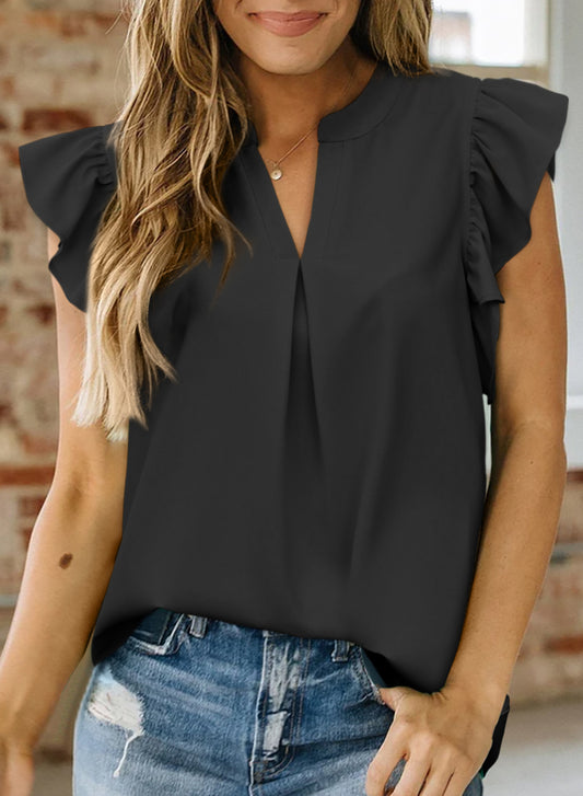 Solid Color V Neck Ruffle Round Neck Pullover Loose Short Sleeve