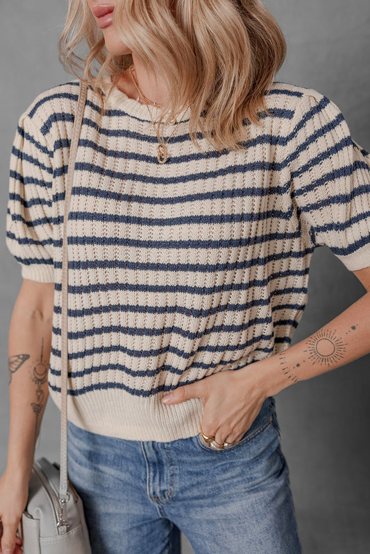 Oatmeal Colorful Striped Eyelet Knit Ruffled Sleeve Sweater T Shirt