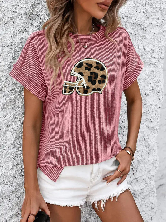 Twisted Ribbed Texture Graphic Tee with Blue Bow Print