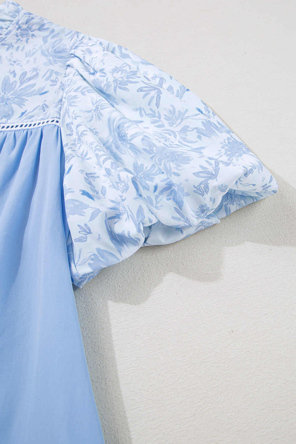 Beau Blue Lace Insert Floral Puff Sleeve Patchwork Loose Blouse