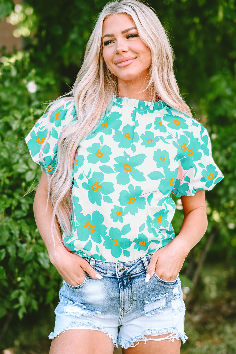 Beige Floral Puff Sleeve Frilled Neckline Blouse