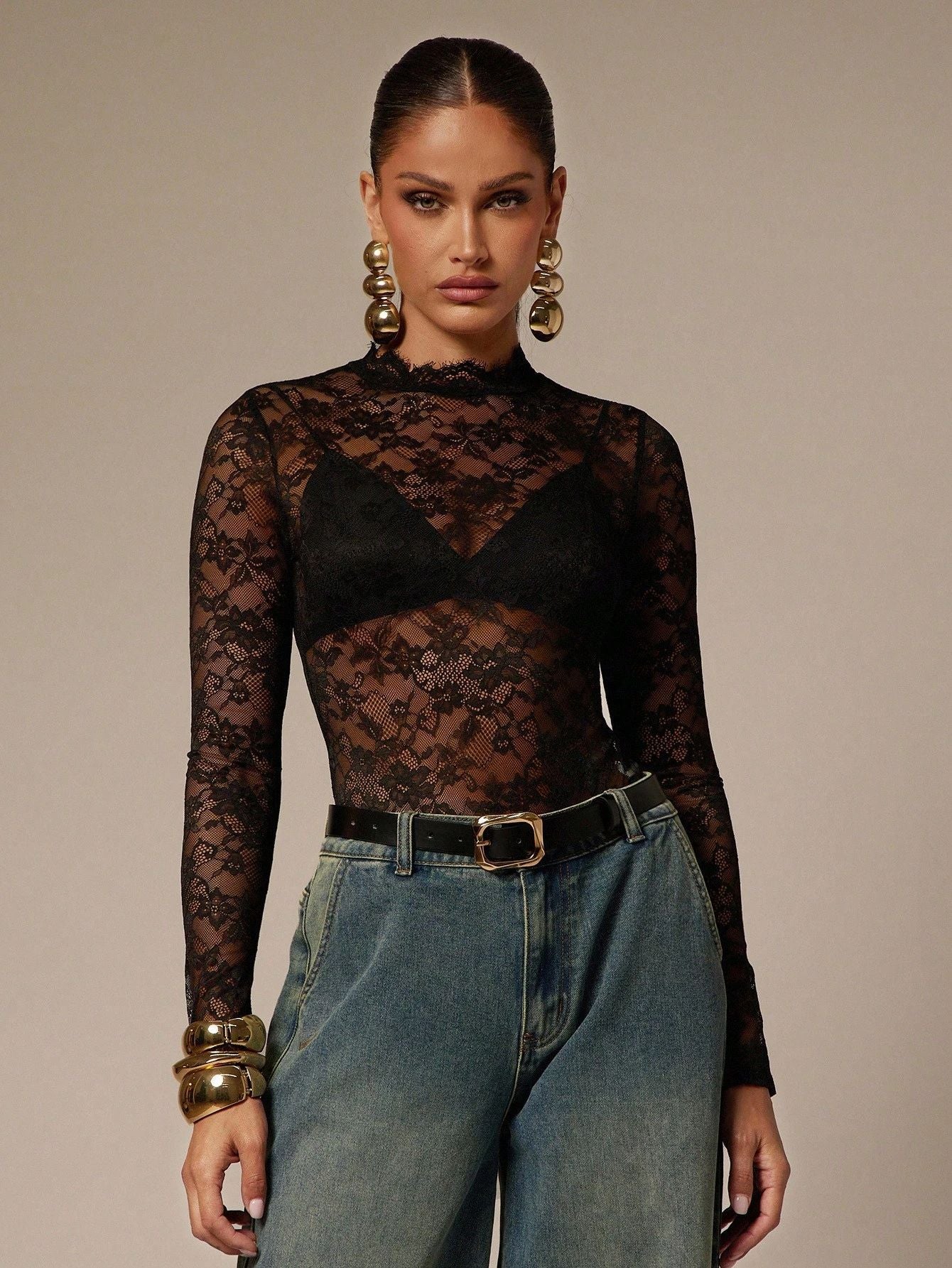 Black Lace Mock Neck Long Sleeve Sheer Bodysuit Top