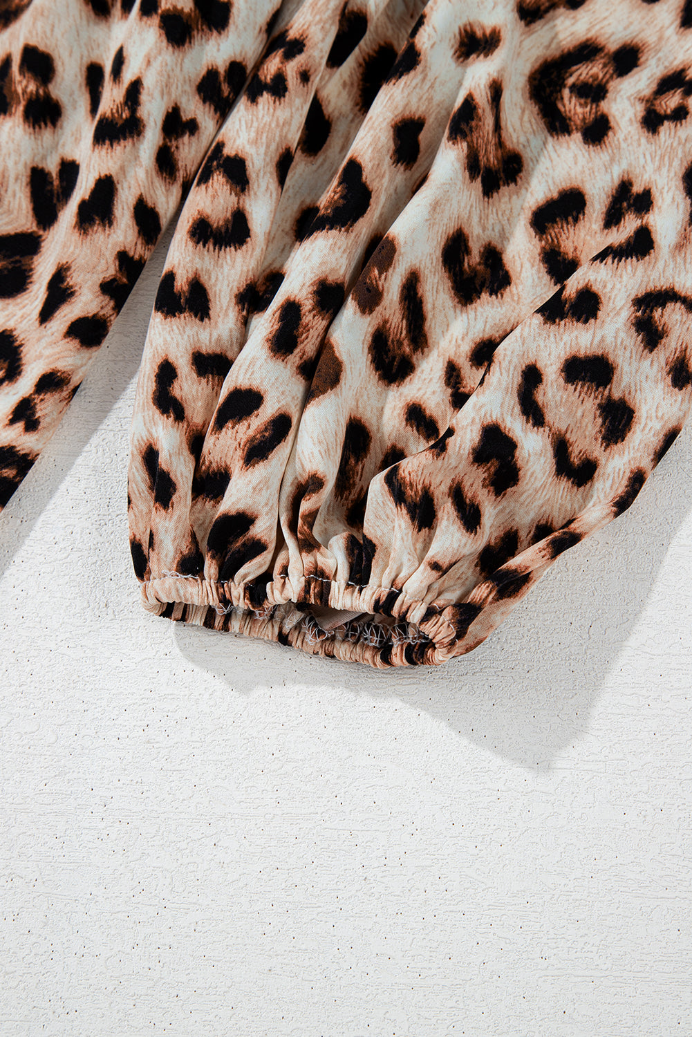 Khaki Cheetah Color Block V Neck Balloon Sleeve Babydoll Blouse