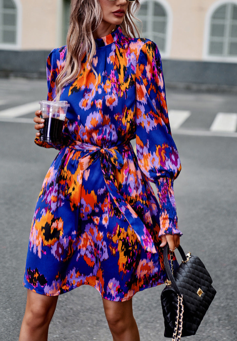 - Floral print, stand collar, shirred mock neck, tie neck, long sleeve, high elastic waist, A-line ruffle short dress