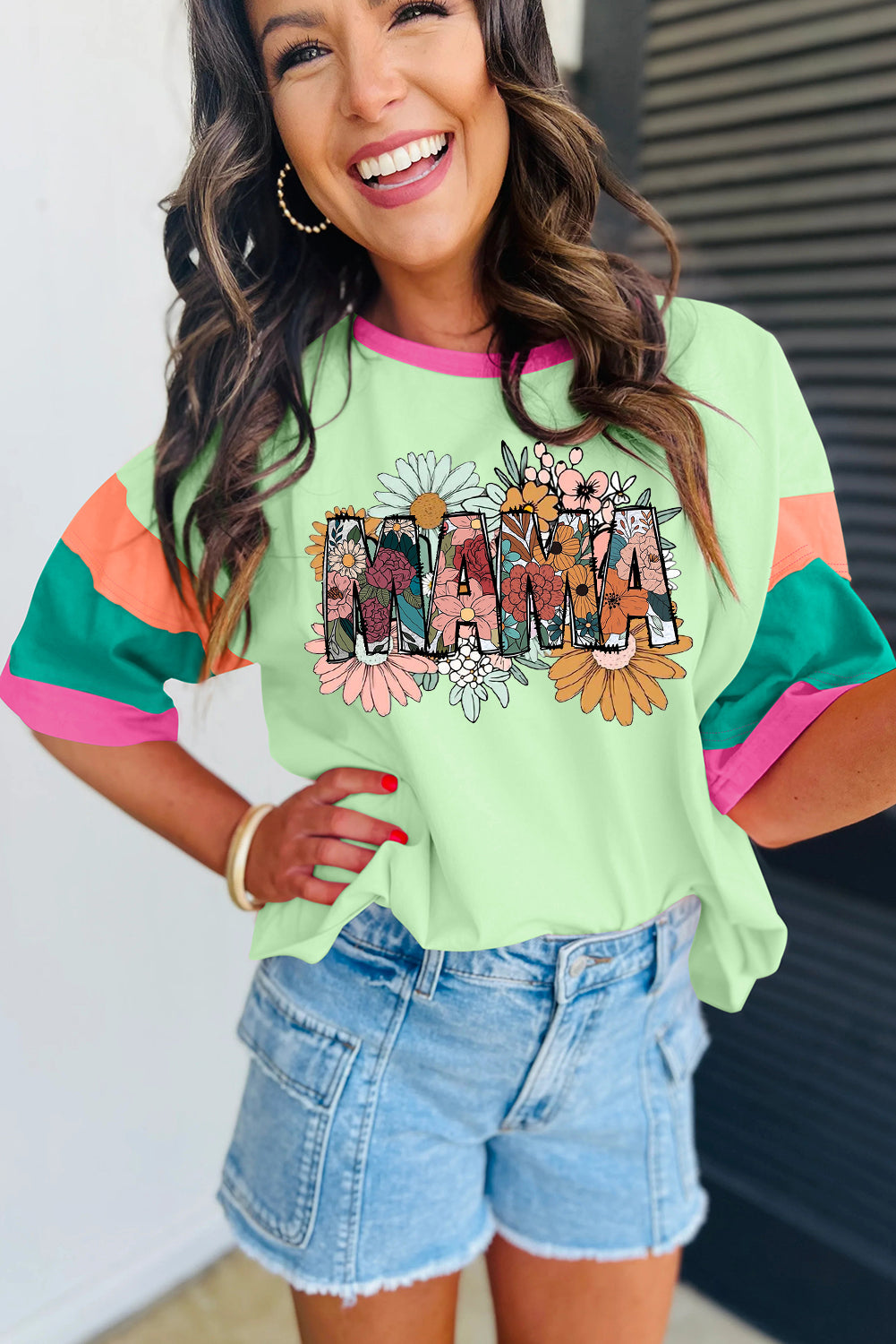 Mother's Day Floral Print Block Stitching Sleeve Round Neck Oversize Top