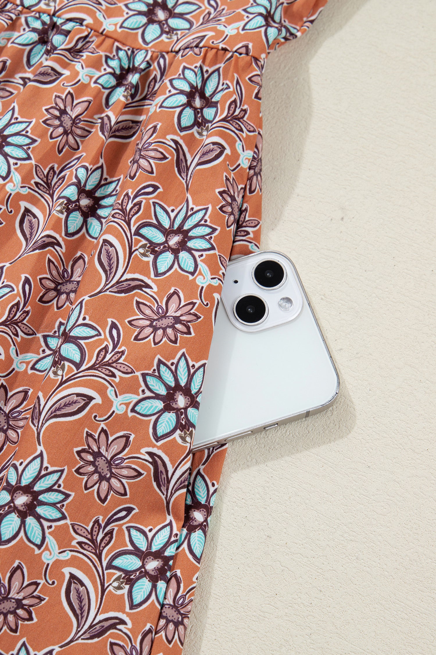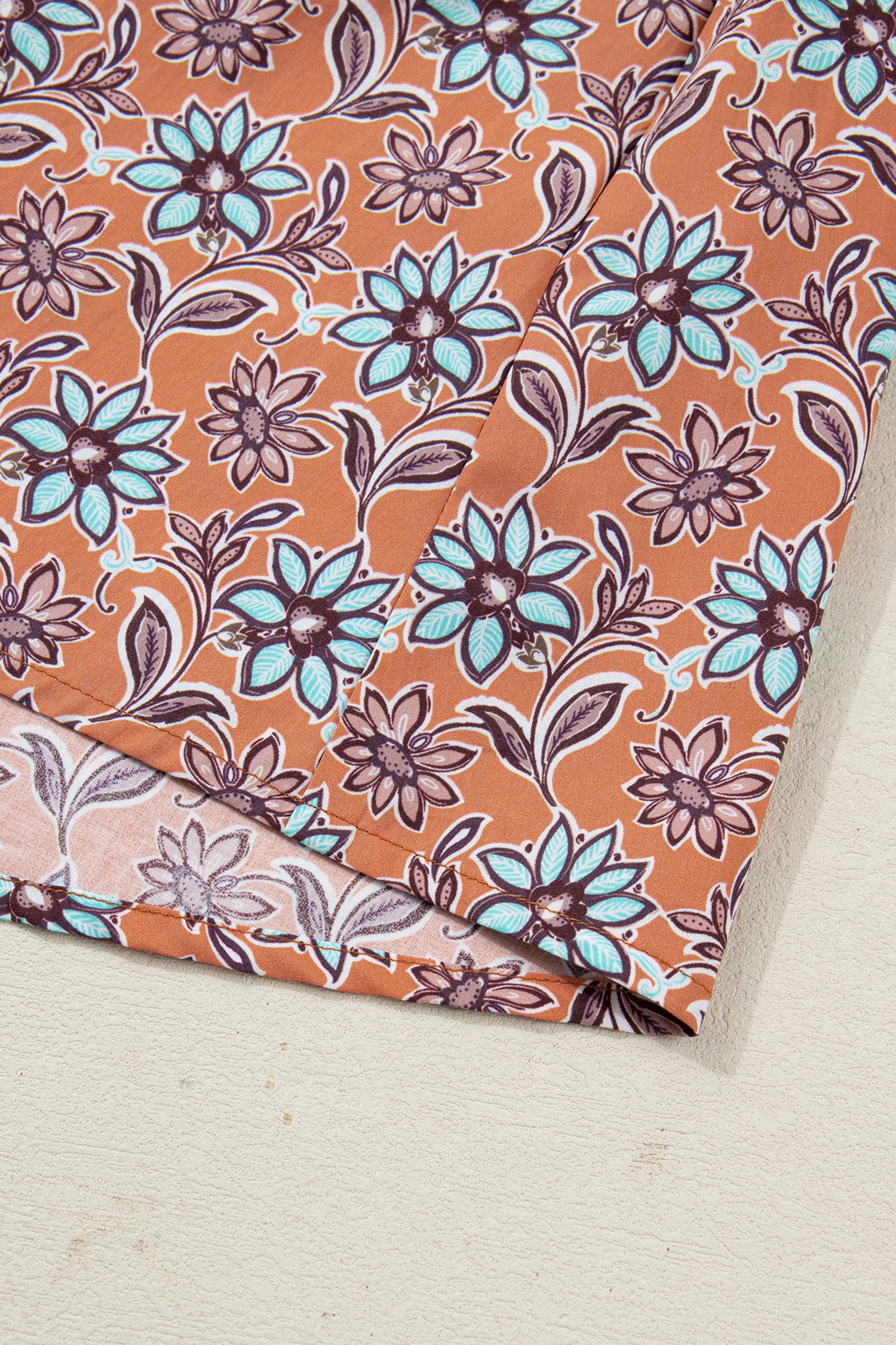 Orange Boho Floral Contrast Collared Shirt Mini Dress