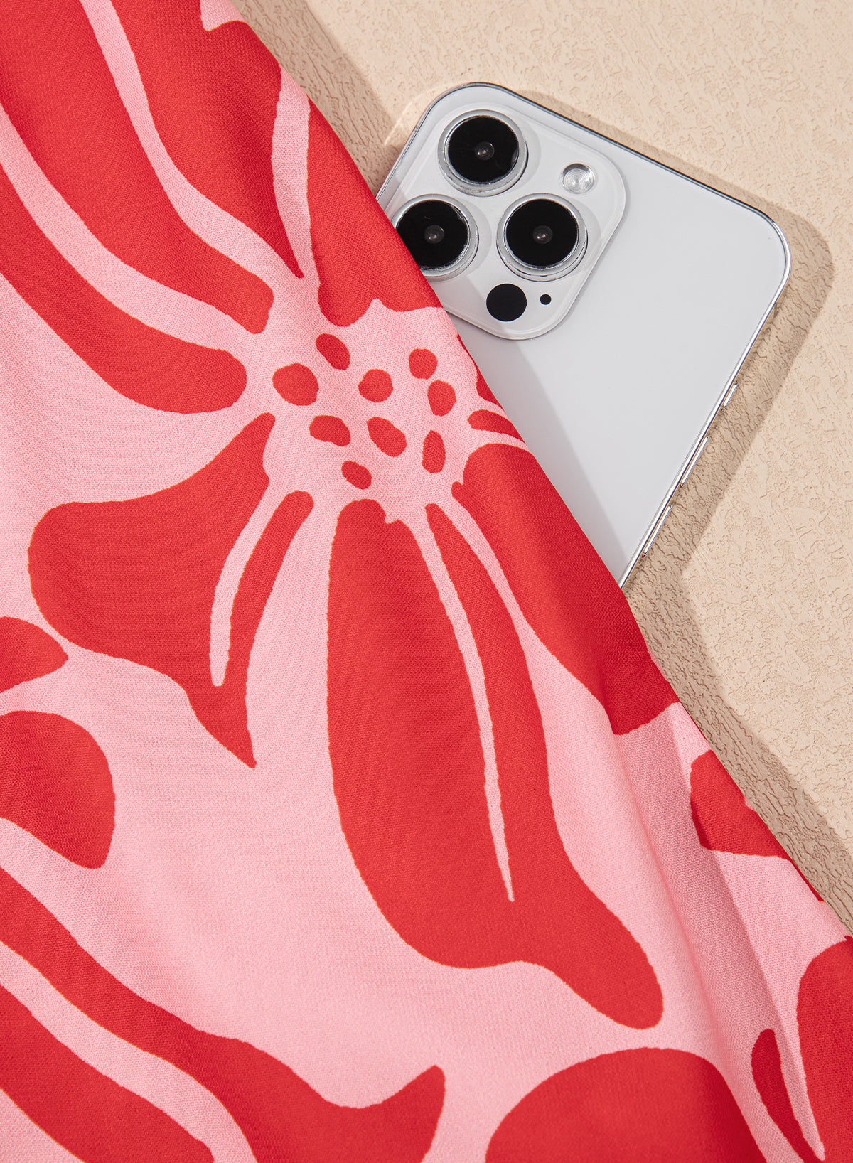 Red Boho Floral Short Sleeve V Neck Buttoned Shirred Waist Long Dress