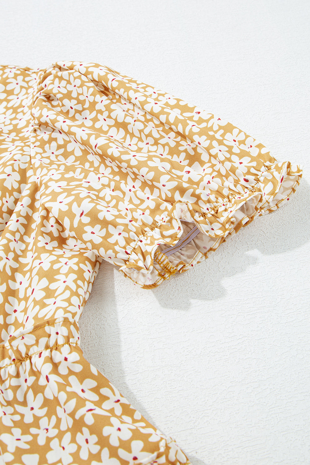 Yellow Floral Short Sleeve V Neck Frilly Tiered Mini Dress