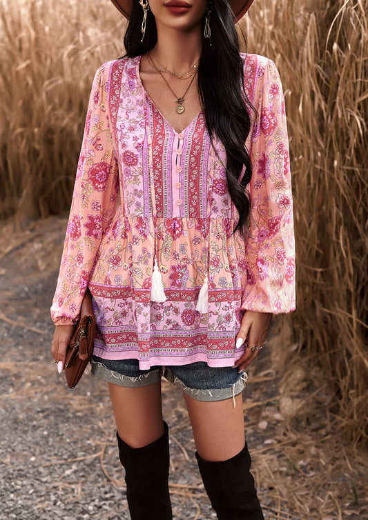 Pink Floral Print Drawstring V Neck Peplum Blouse