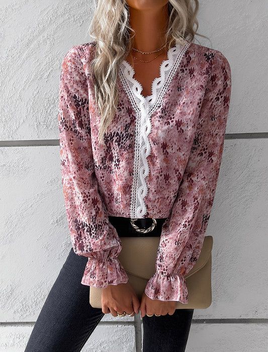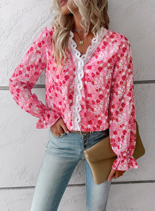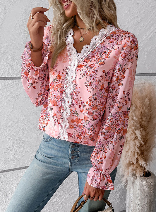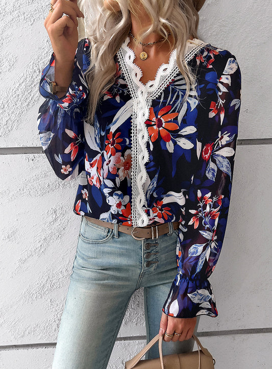 Beau Blue Lace Insert Floral Puff Sleeve Patchwork Loose Blouse