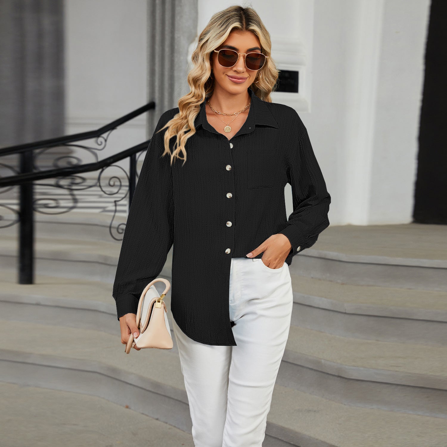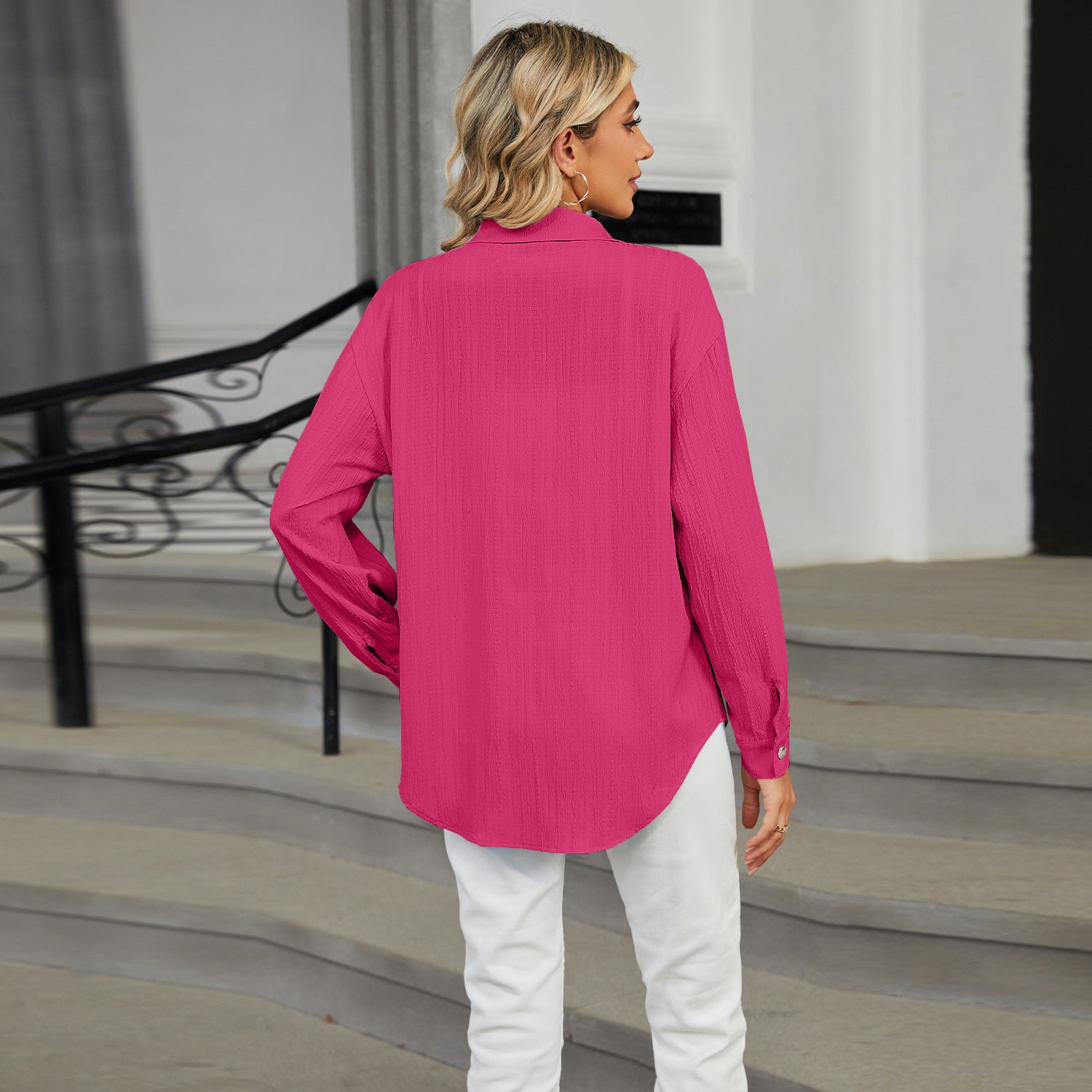 - FEATURES: Women's Button Down Shirt, Chest Pocket, Full Button Closure, Dropped Shoulder, Solid Color, Curved Hem, Special Textured Fabric, Neckline V-Neck Tunic, Lapel Neck, Long Sleeve Button Down Shirt, Can be Rolled Up 3/4 Sleeve or Full Sleeve, Loose Fit Shirt.
