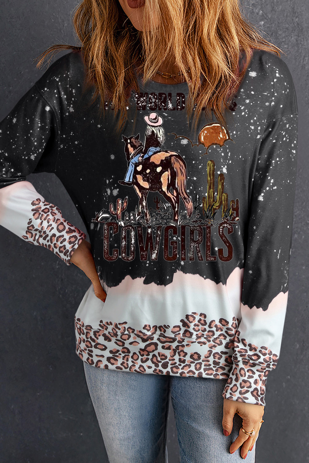 Bleached Pullover Western Cowgirl Pattern Sweatshirt