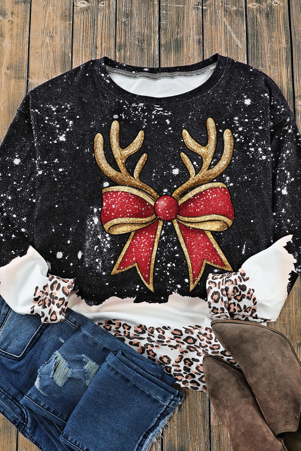 Christmas Antler Bow Bleached Pullover Sweatshirt
