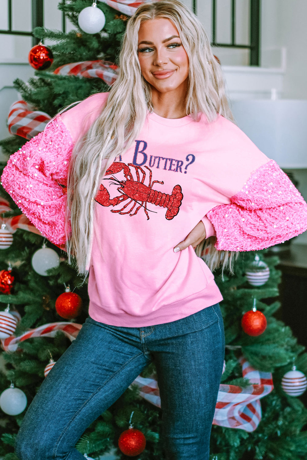 Lilac Sweatshirt with Glitter Sleeves and Lobster Graphic