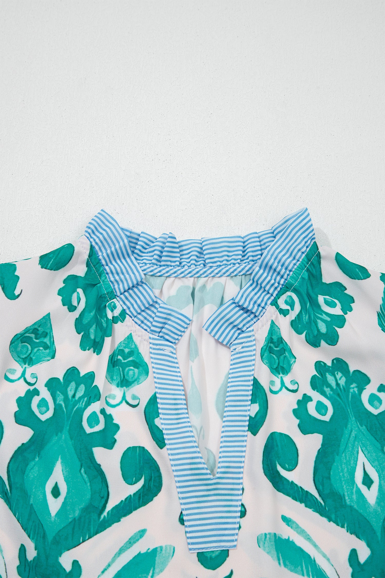 Sky Blue Ethnic Print Striped Trim Flutter Sleeve Top