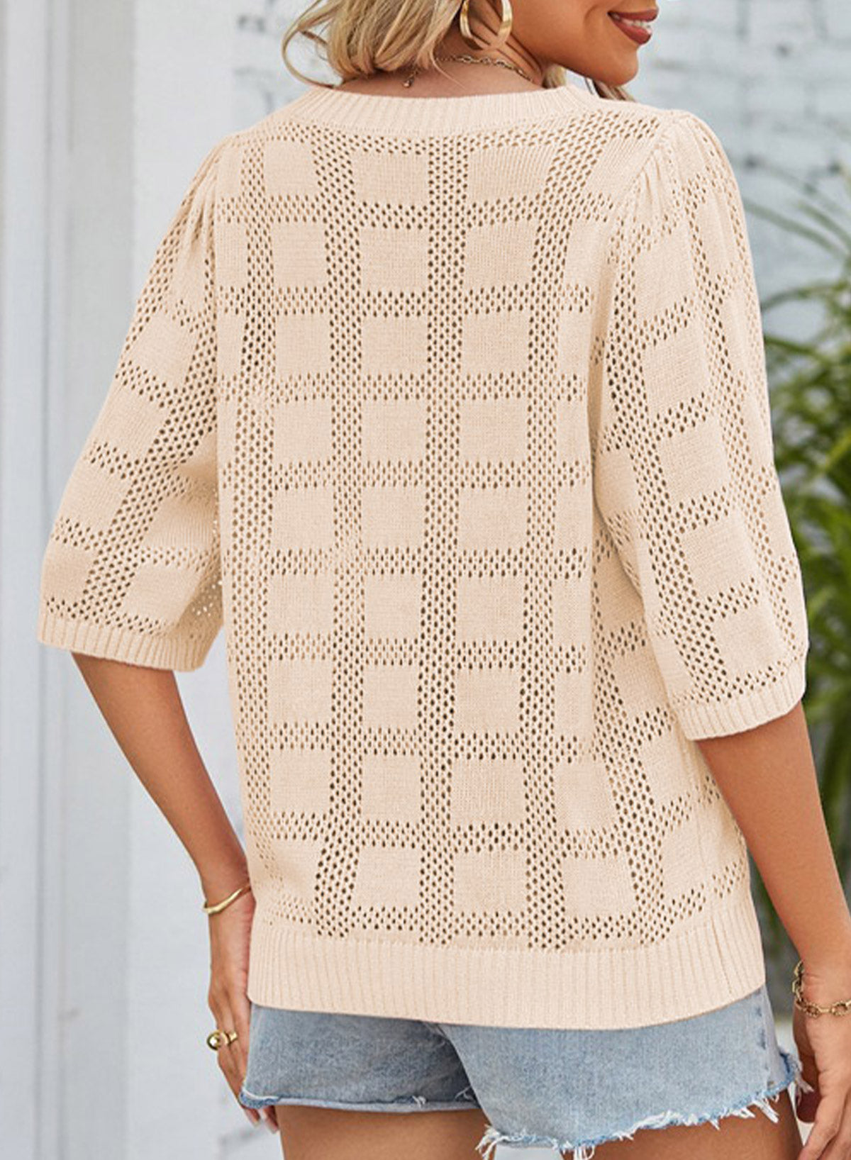 Solid Color Crew Neck Plaid Hollow Out Pullover Sweater
