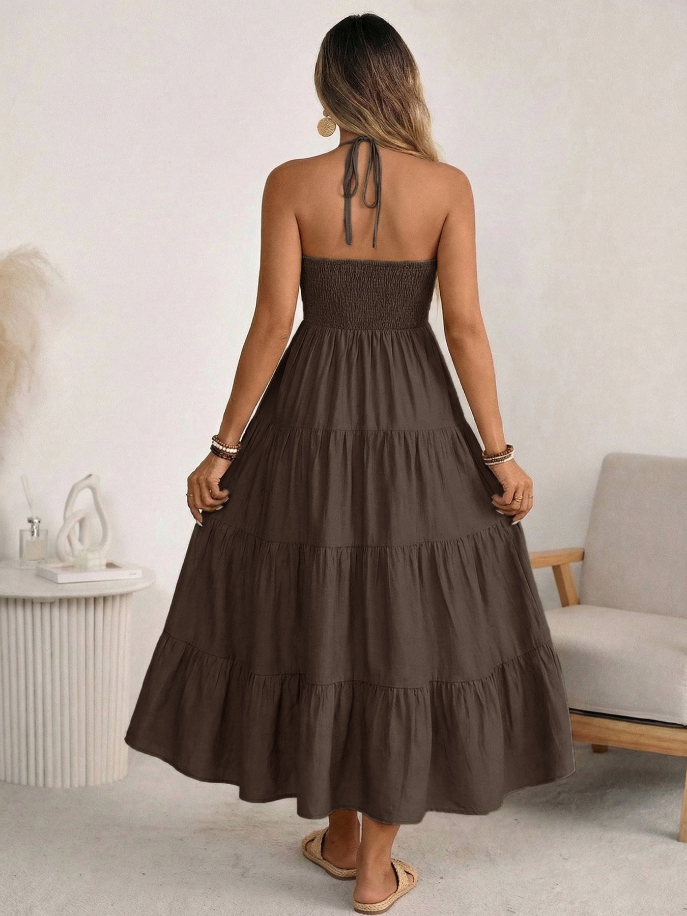 This women’s solid color halter maxi dress delivers an effortless vacation vibe with a clean, minimal look—perfect for spring/summer boutique resort and travel collections.