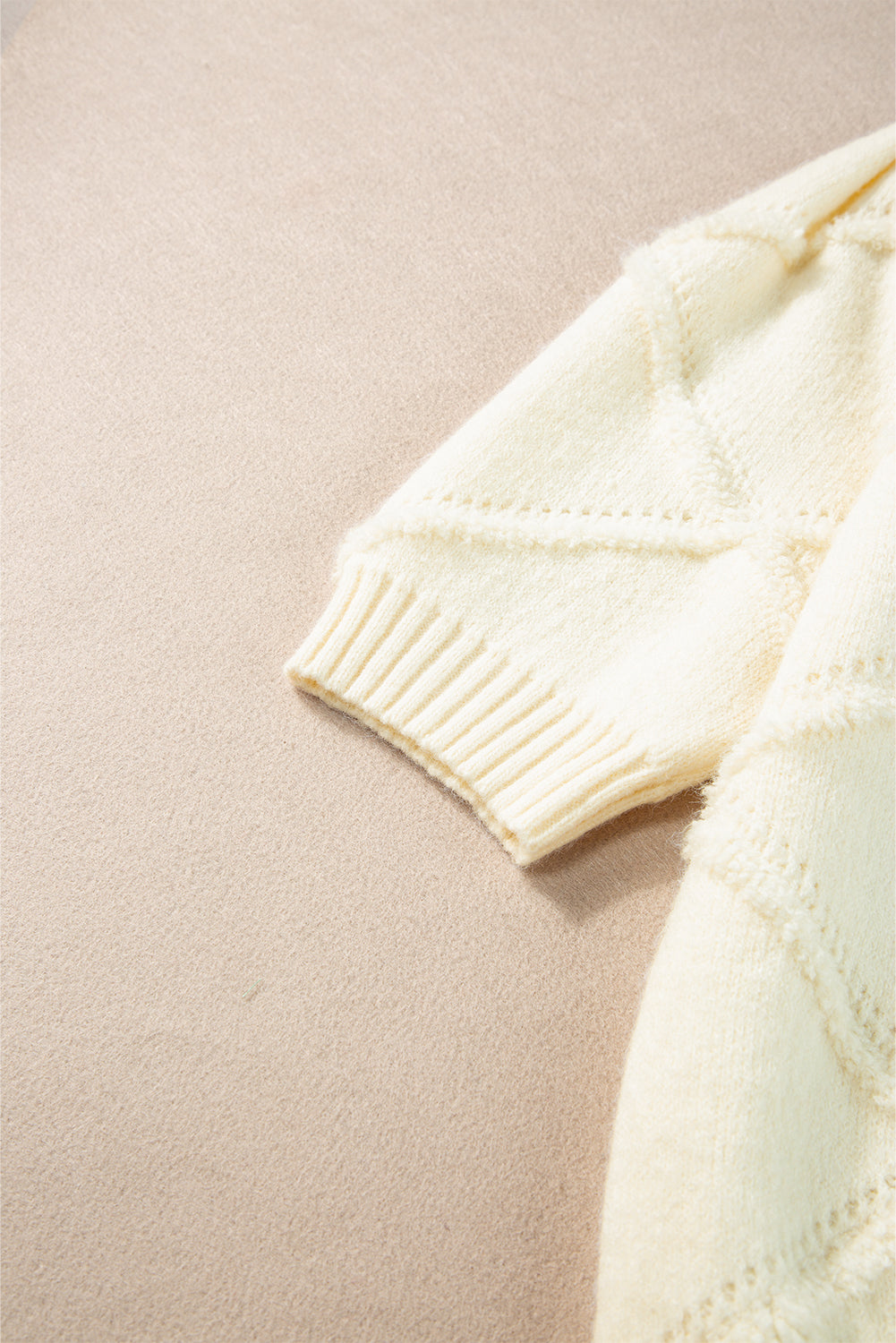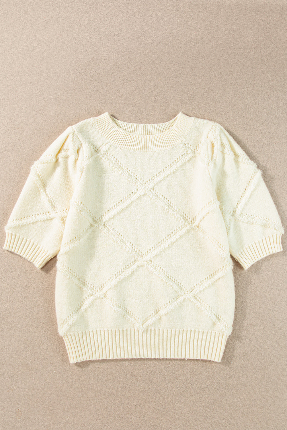 White Rhombus Pattern Ribbed Trim Short Sleeve Sweater