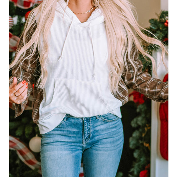 White Waffle Patch Plaid Sleeve Kangaroo Pocket Hoodie