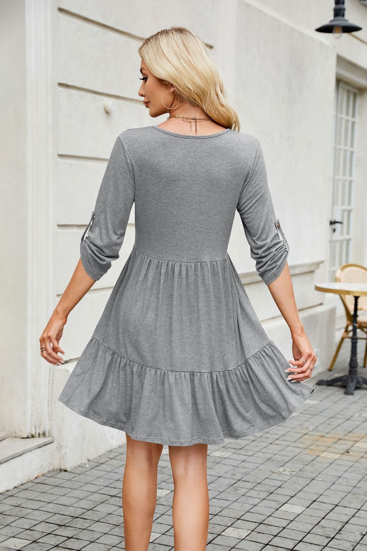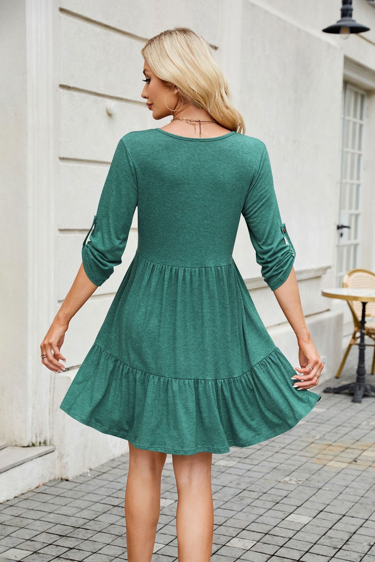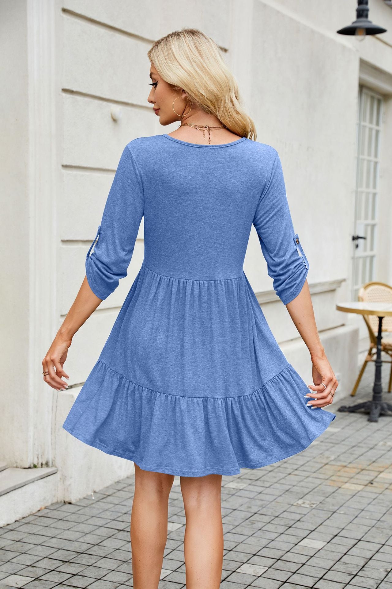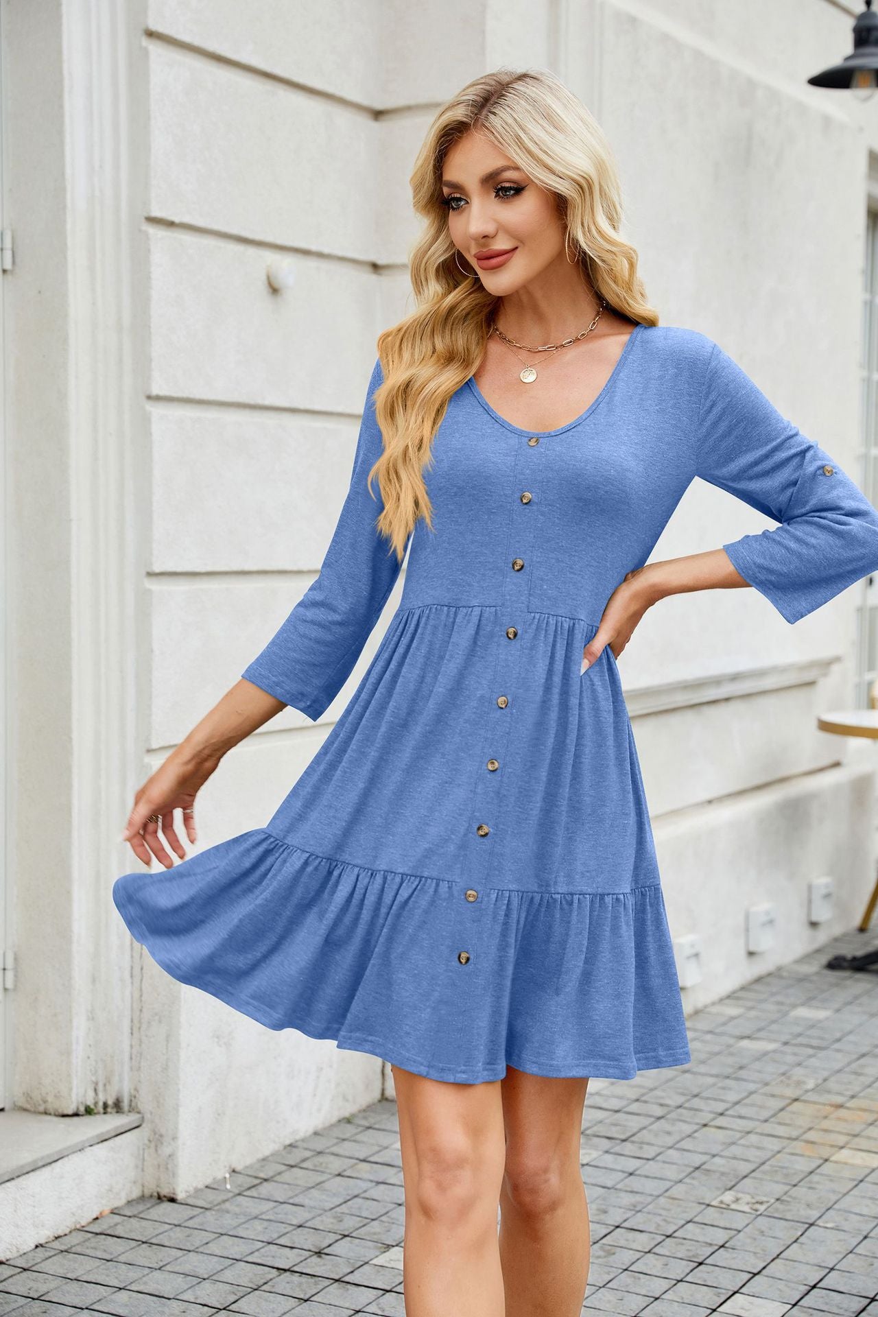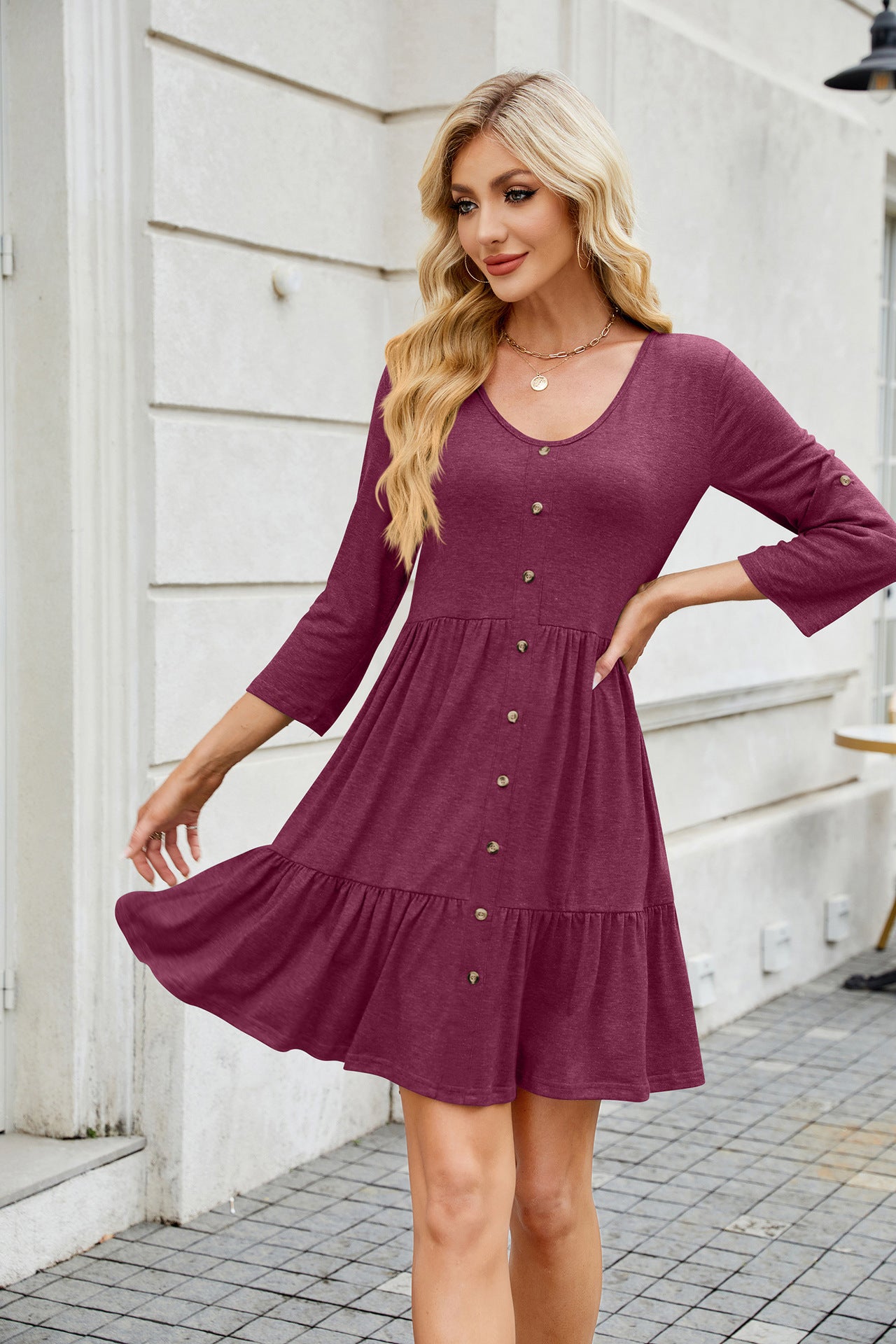 Effortless Elegance: This button-front midi dress features a V-neckline, ruffled hem, and 3/4 sleeves, creating a relaxed yet feminine silhouette perfect for everyday wear.