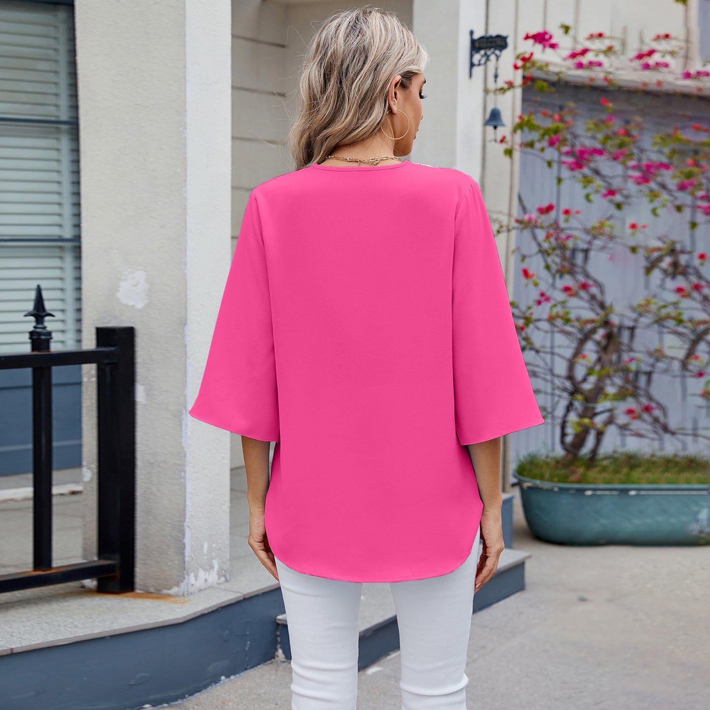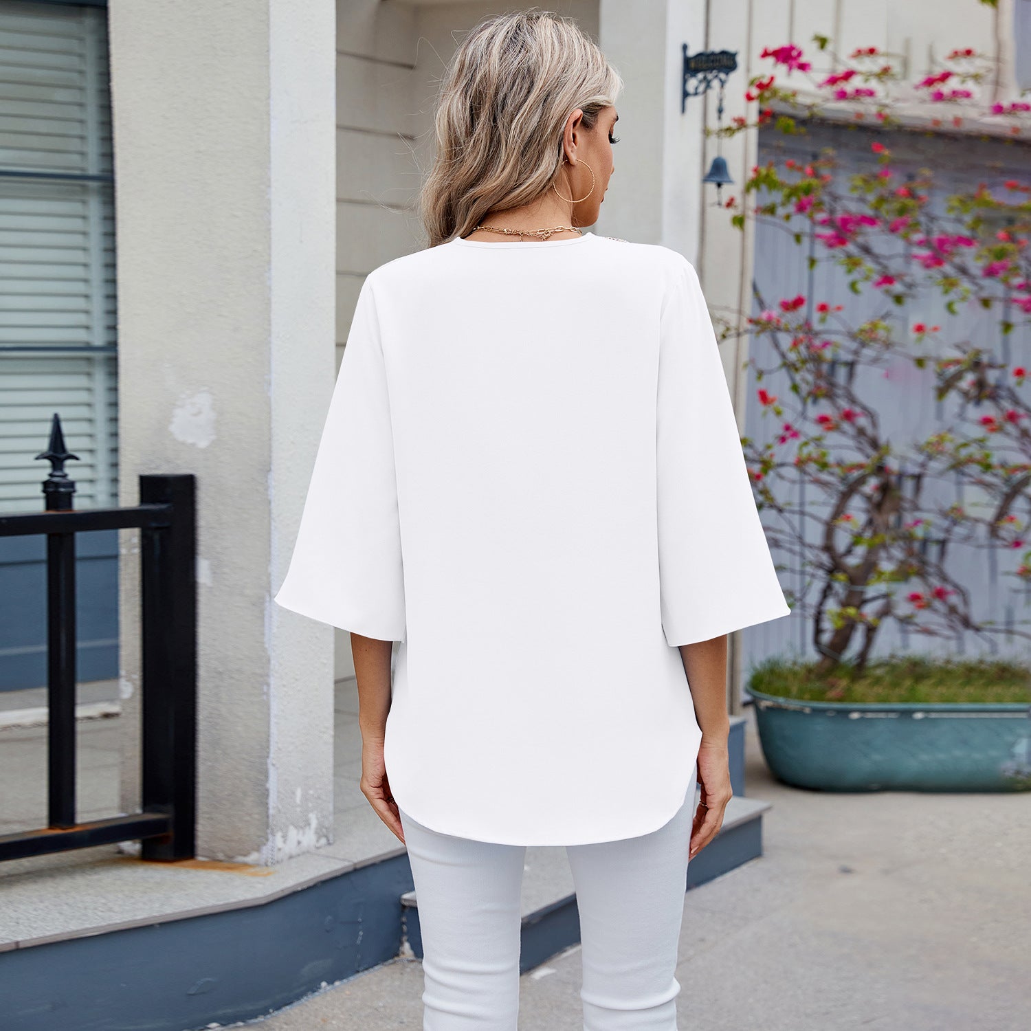 Sophisticated Design: This V-neck chiffon blouse features delicate lace trim and split half sleeves, offering a refined, elegant look perfect for both casual and dressy occasions.