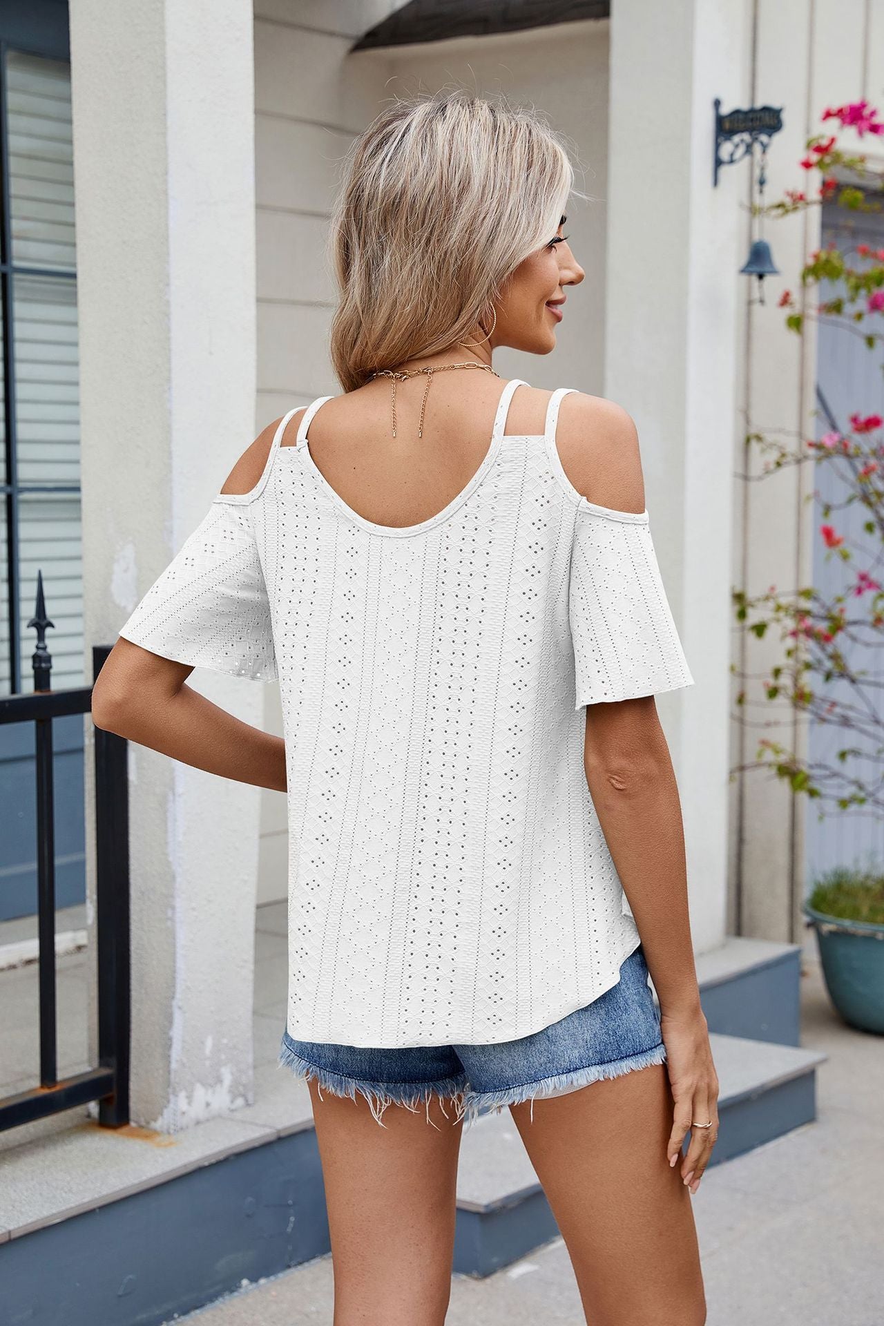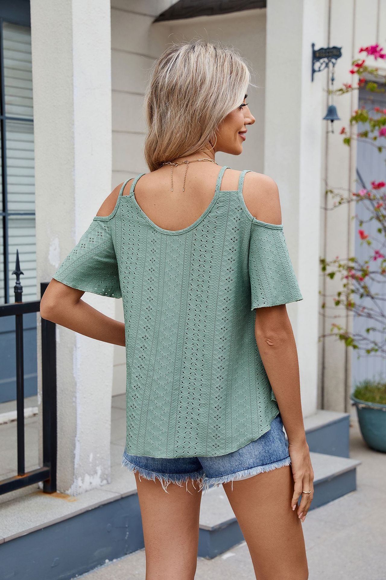 Open Shoulder Lace Detail Short Sleeve Blouse