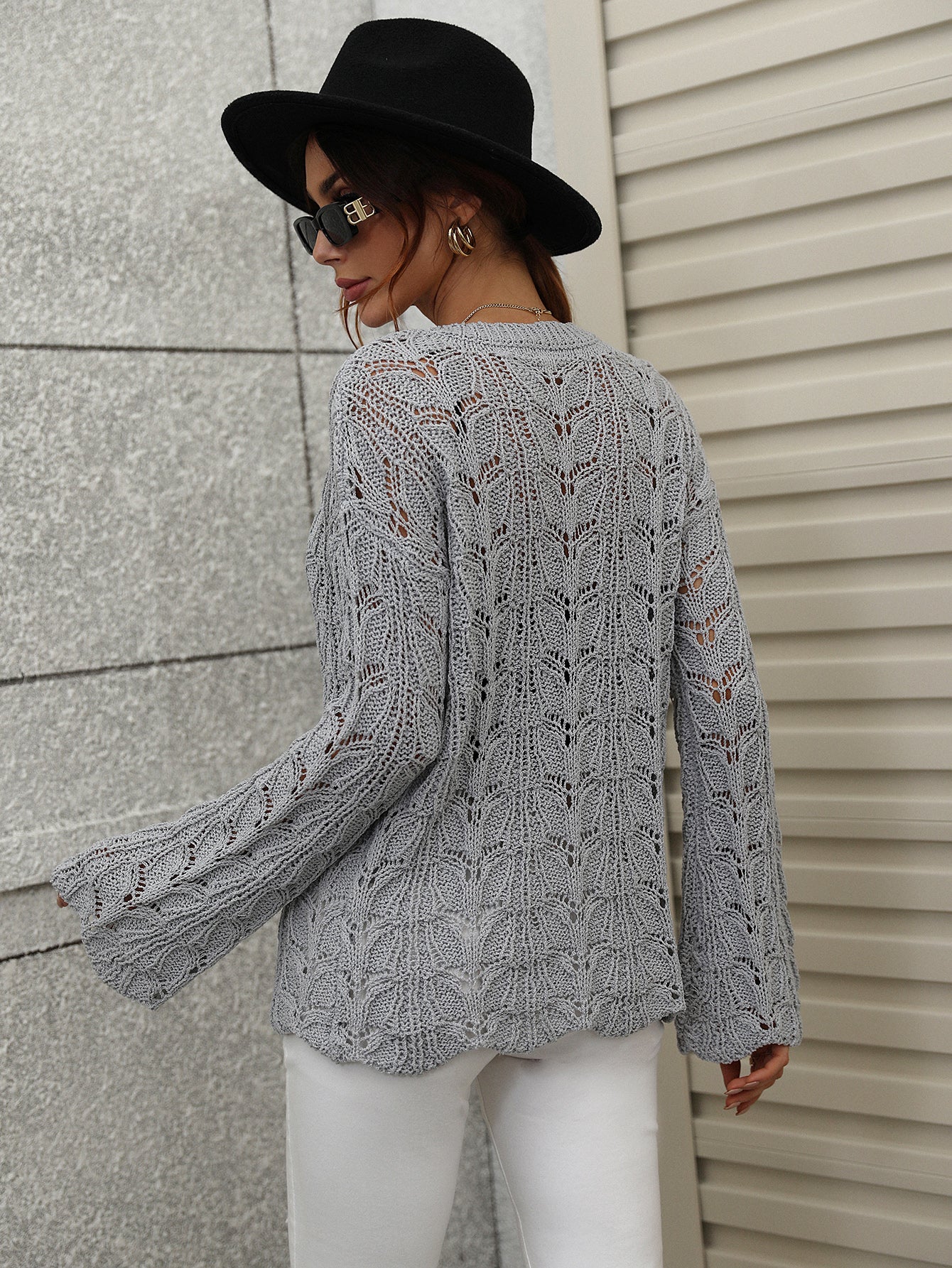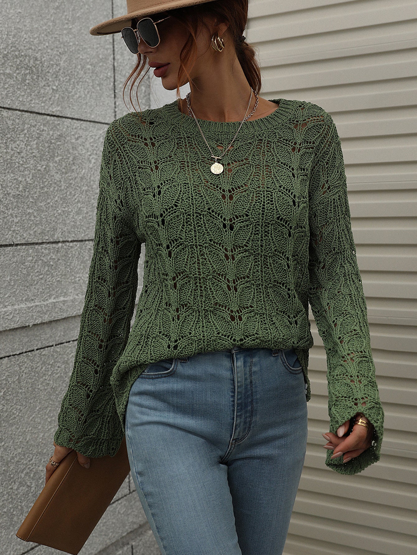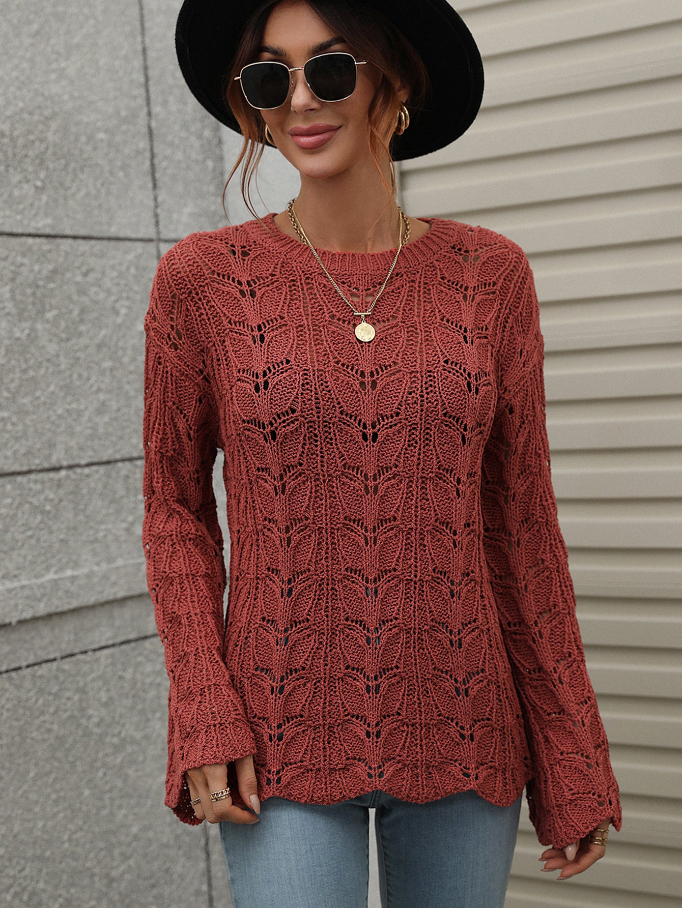 Knit Solid Color Hook Hollow Pullover Round Neck Sweater