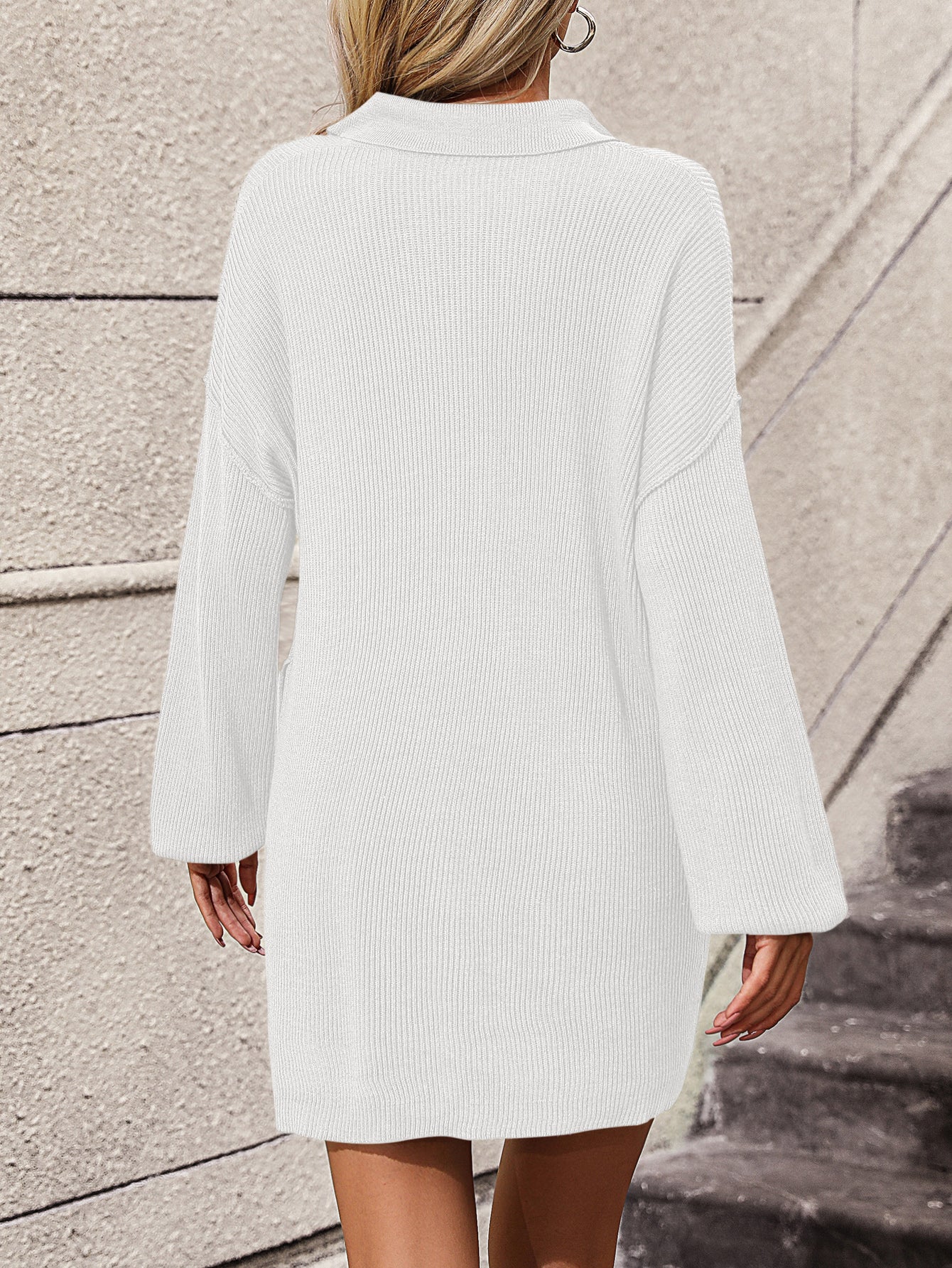 Solid Color Lapel Knit Long Sleeve Mini Sweater Dress