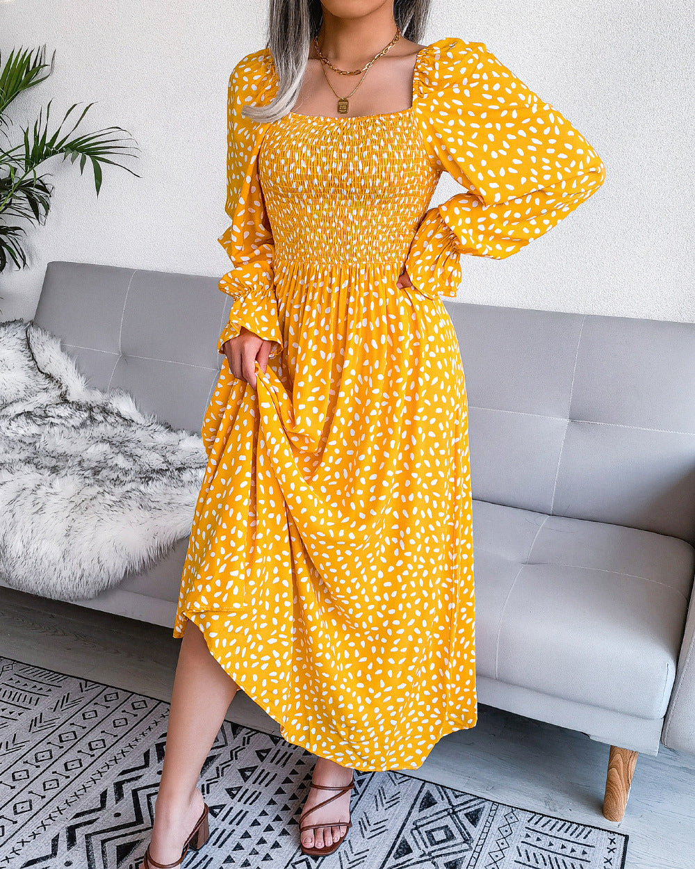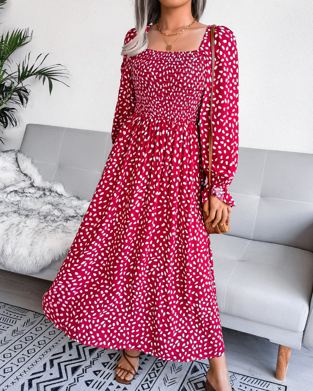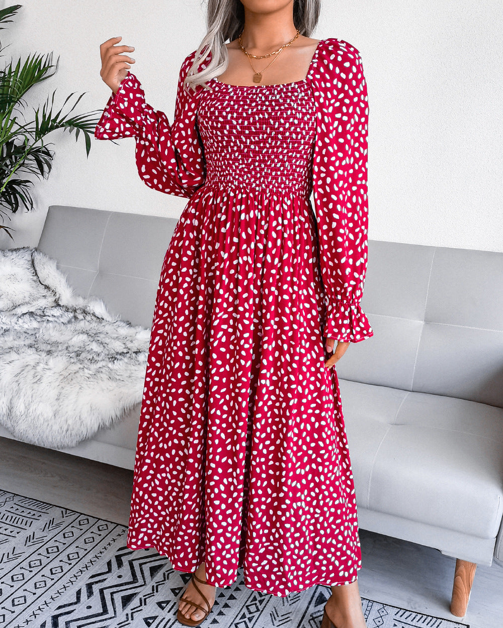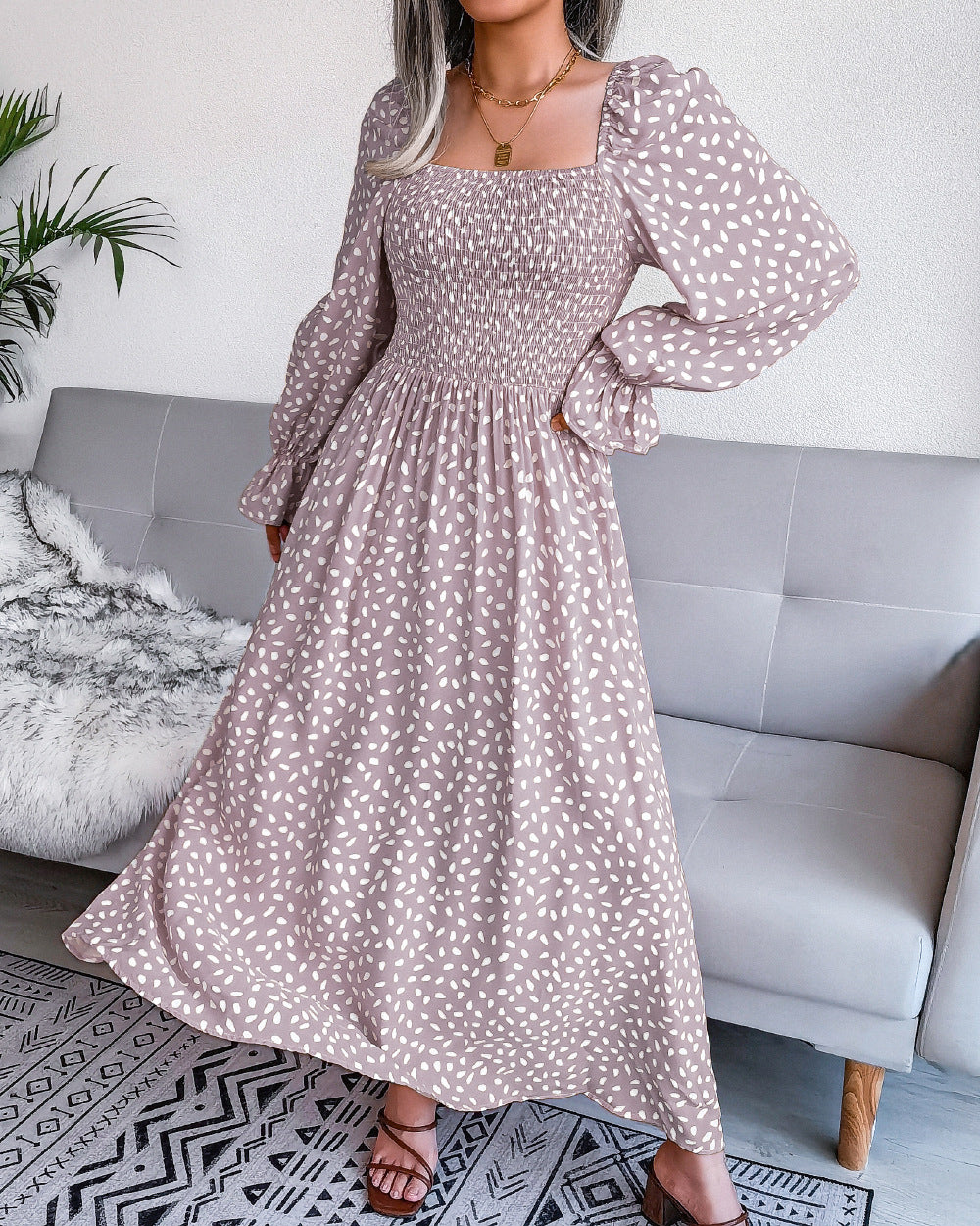 Dresses Pleated Maxi Square Neck Long Sleeve Casual Cotton