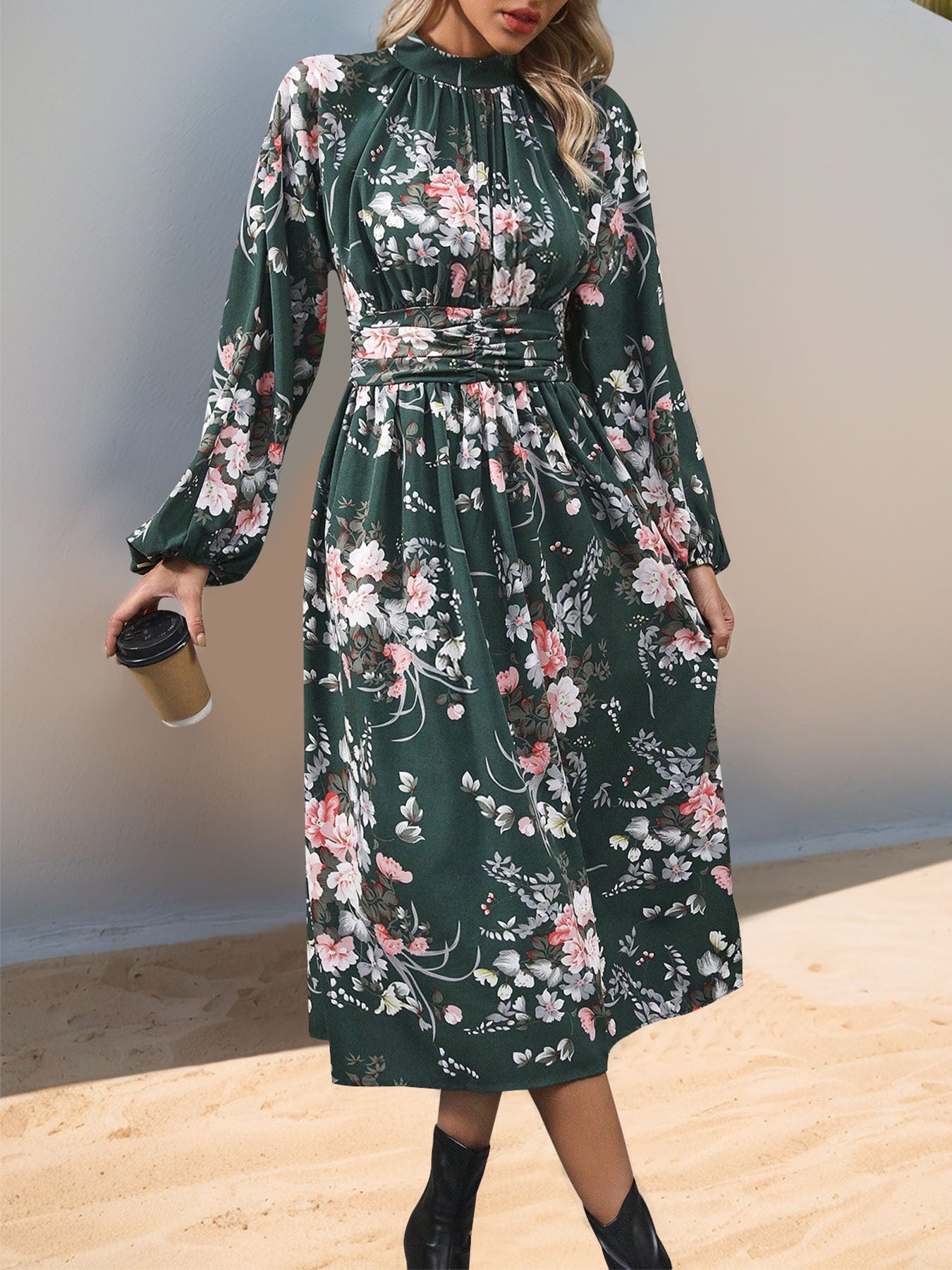 High Waist Dress Long Sleeve Stand-up Collar