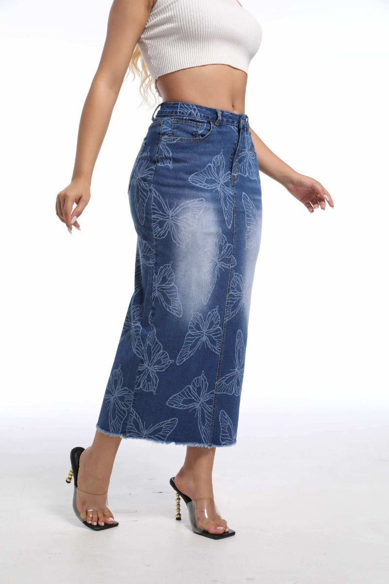 Plus Size Women's Printed Slit Denim Skirt