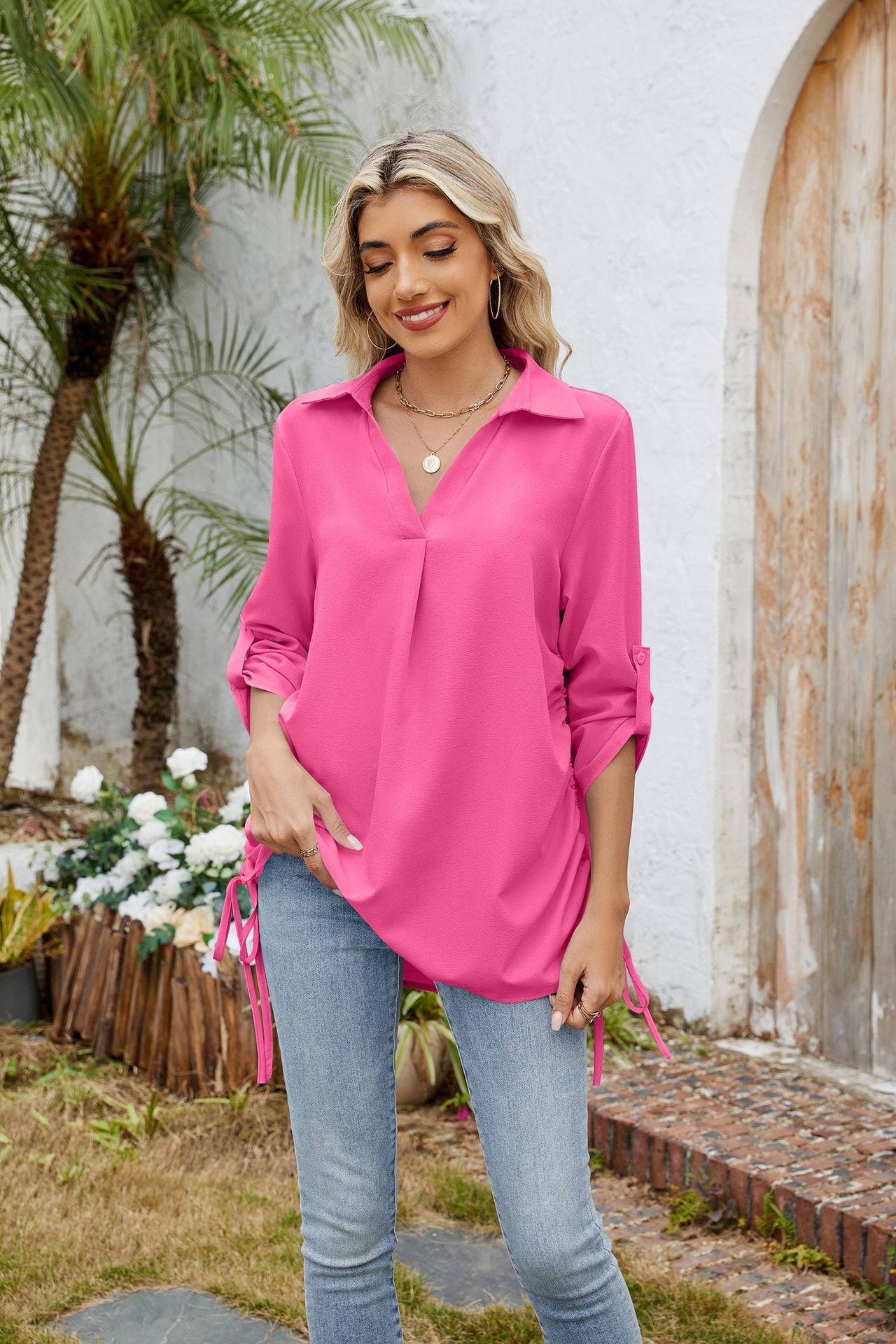 Solid Color Lapel Loose Chiffon Blouse with Mid Sleeves