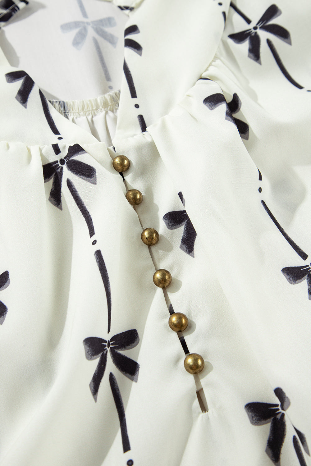 It features frilled v neck, brass button detail front, elegant puff sleeves.