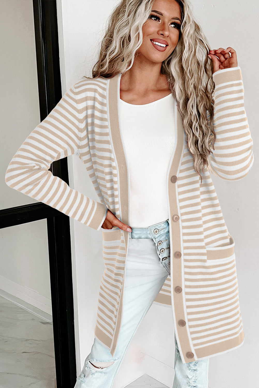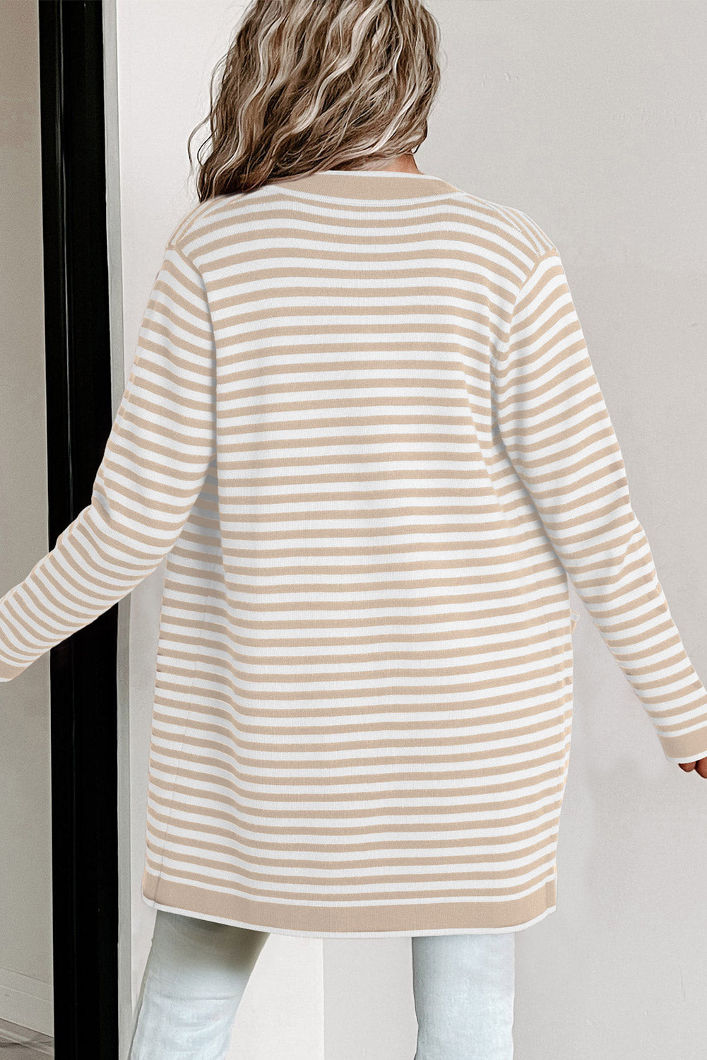 This striped cardigan offers a timeless appeal.