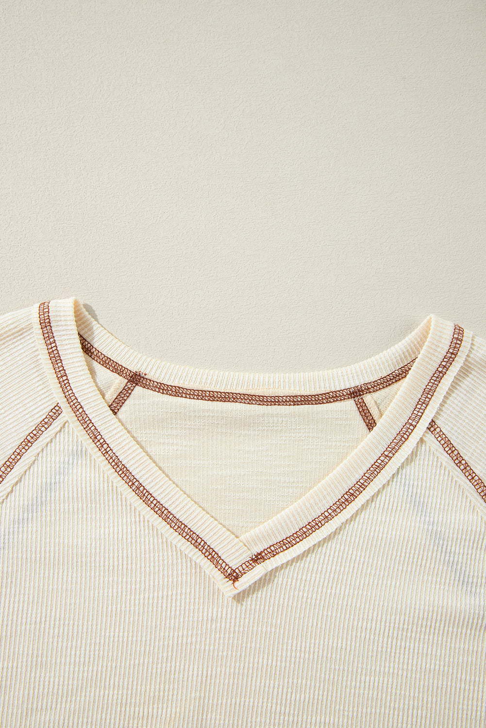 Beige Exposed Seam Textured Knit V Neck Pullover Top