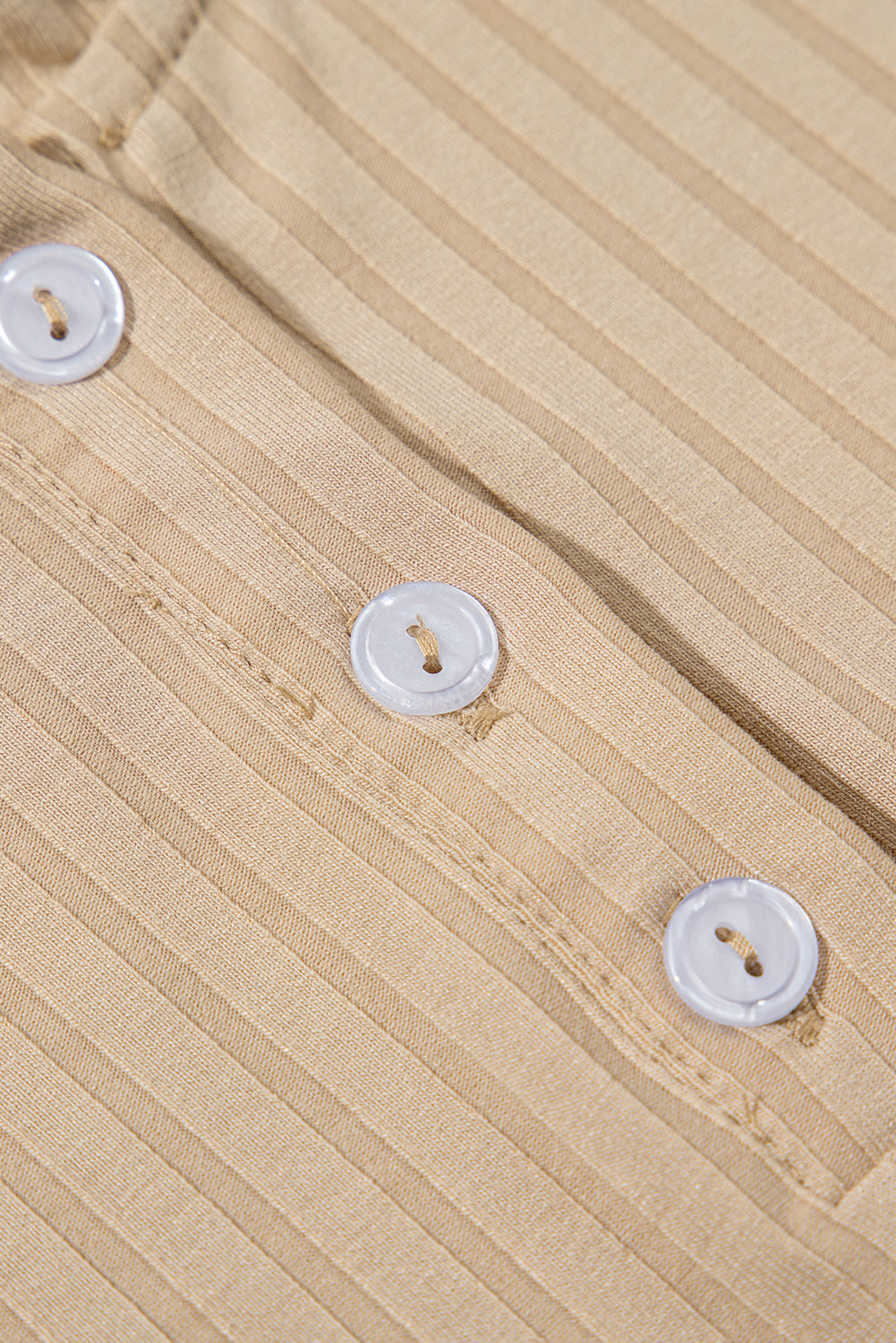 Beige Ribbed Buttoned Collar Long Sleeve Slim Fit Top