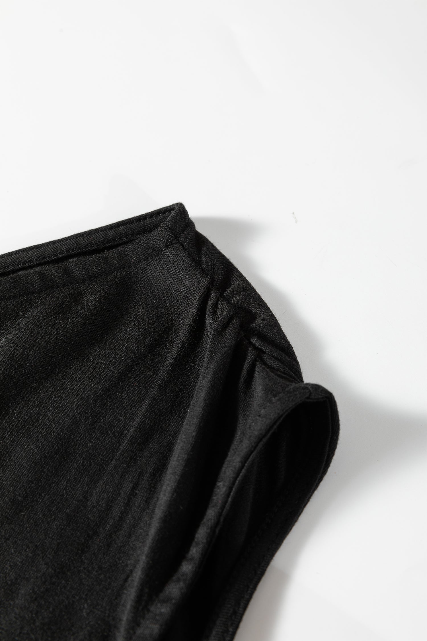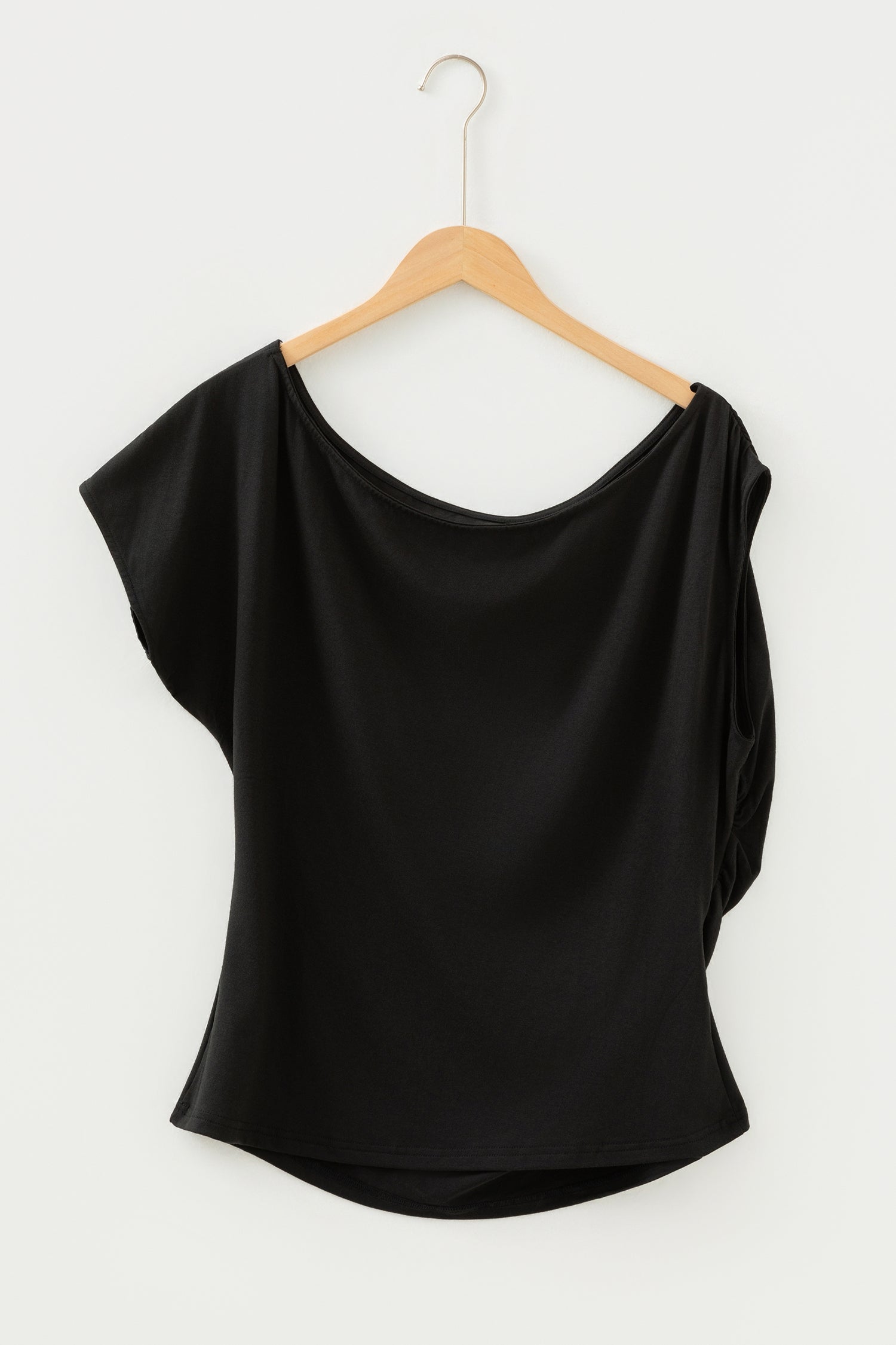 It features an asymmetric neckline with ruched details.