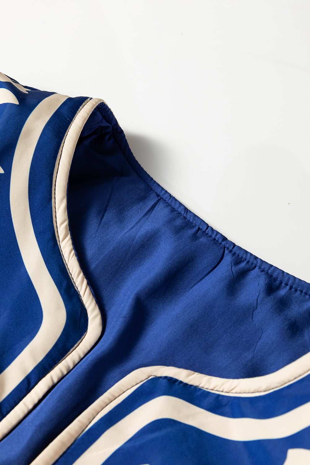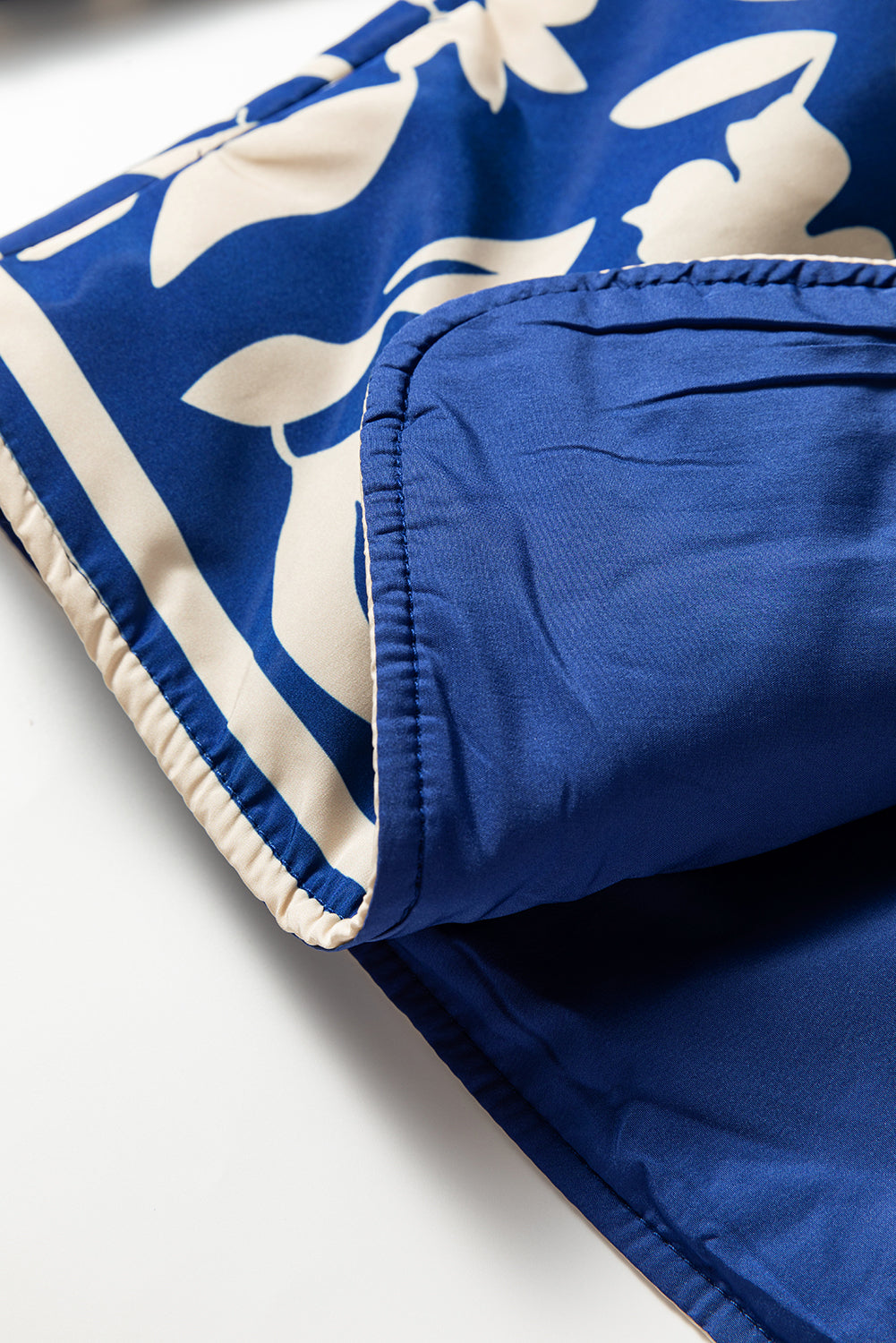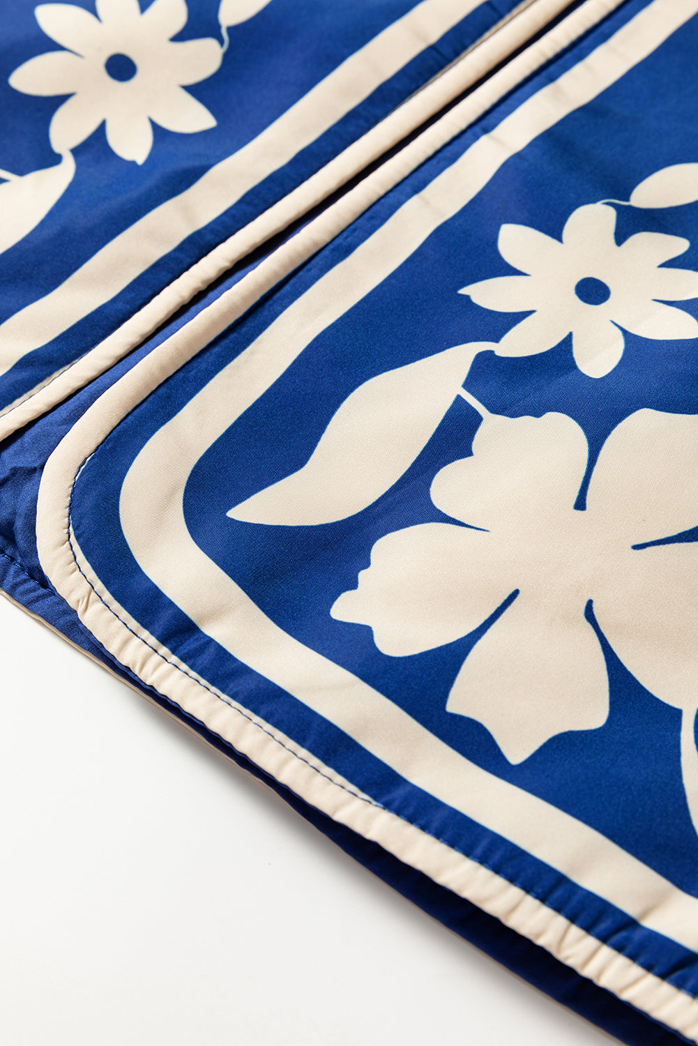 Blue Flower Print Open Front Buttoned Cuffs Elegant Jacket
