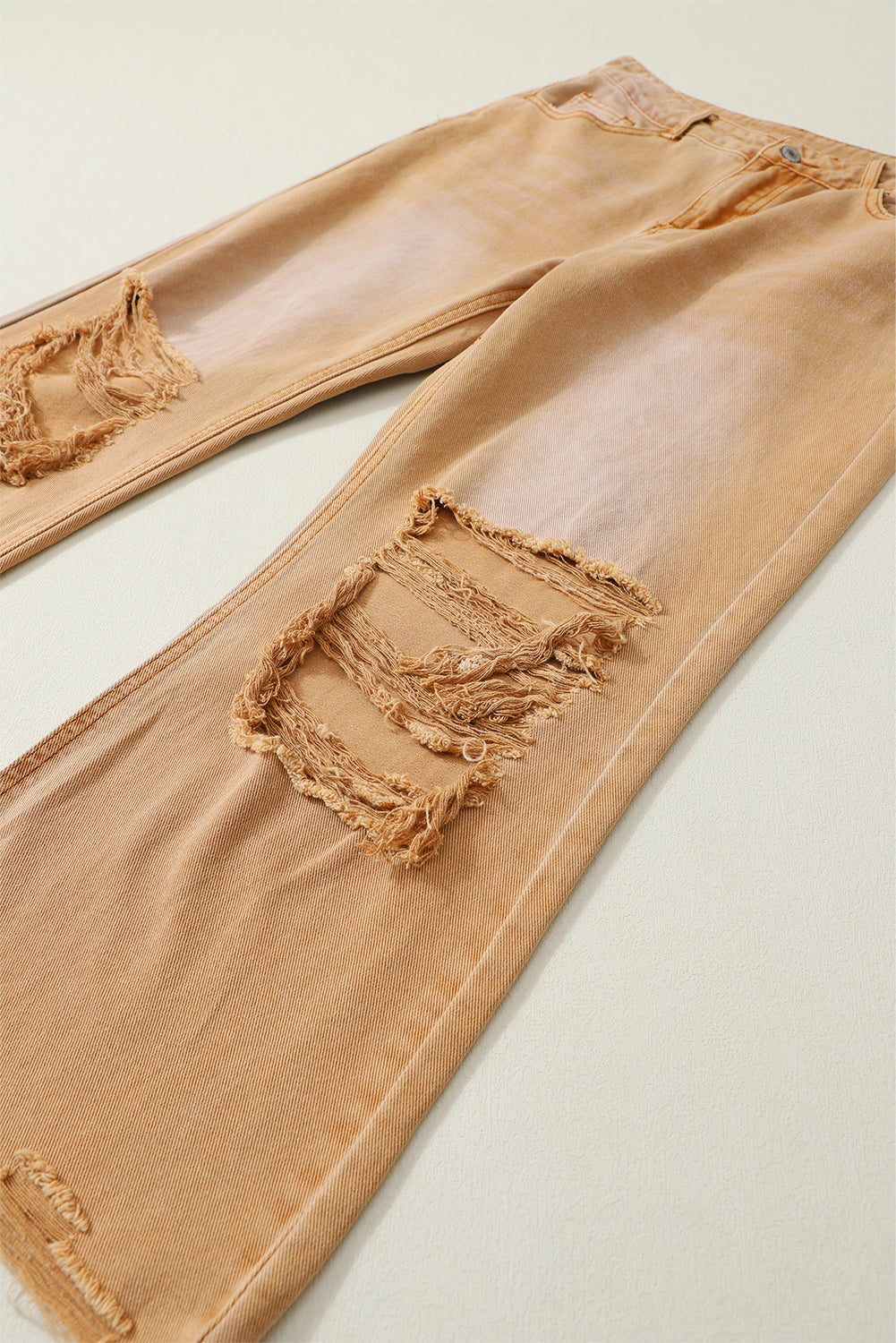 Brown Distressed Hollow-out High Waist Cropped Flare Jeans