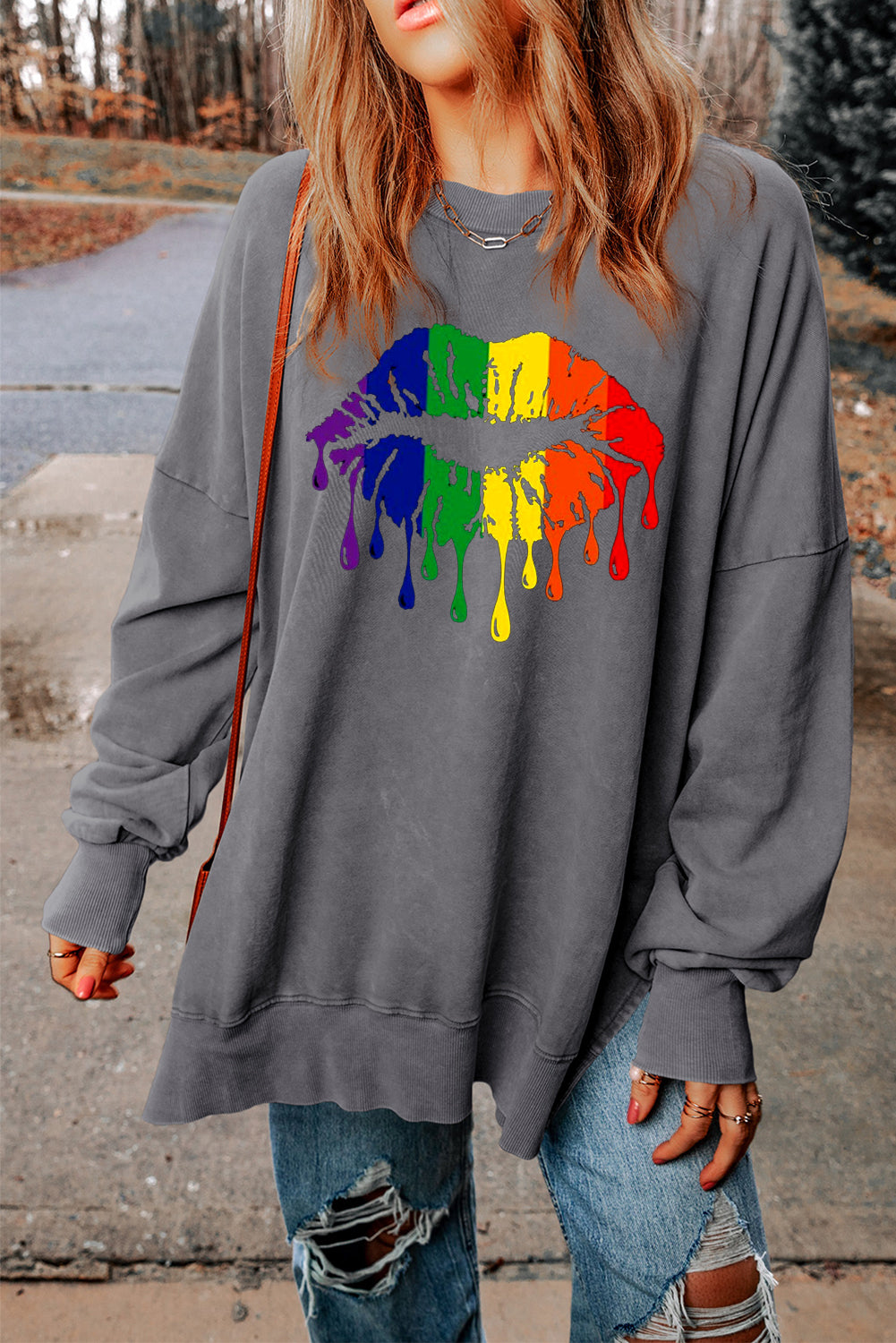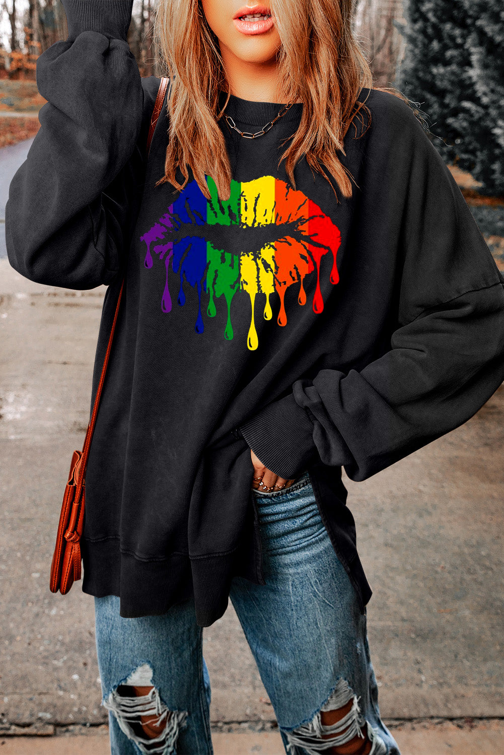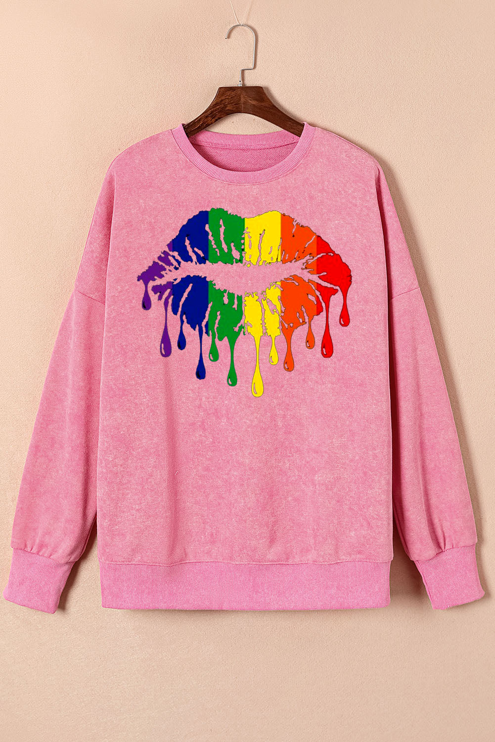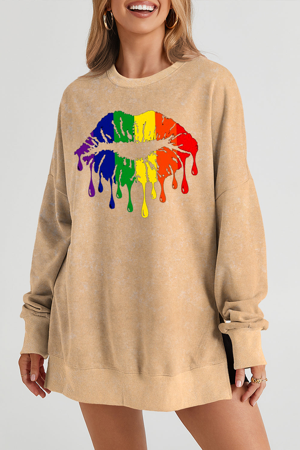 Make a statement with the vibrant rainbow lip print on the front of this cozy sweatshirt. A fun and colorful design that adds an energetic touch to any casual outfit.