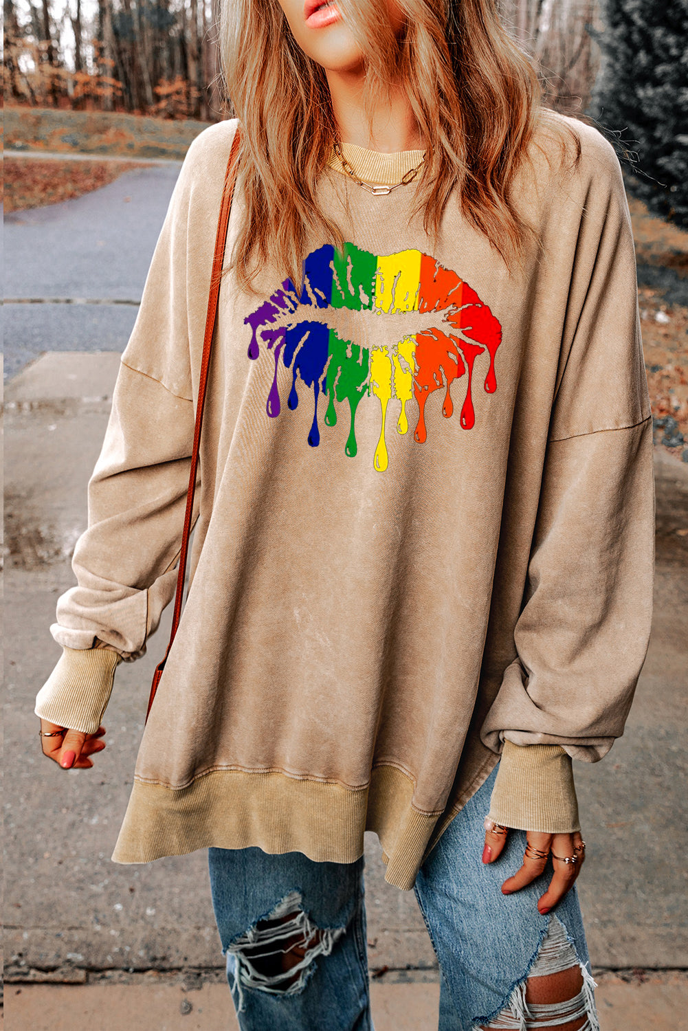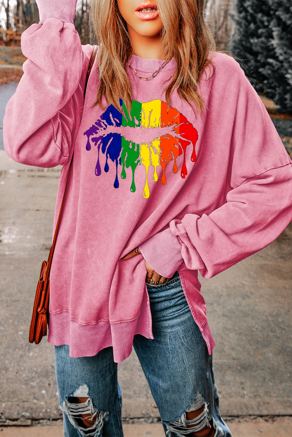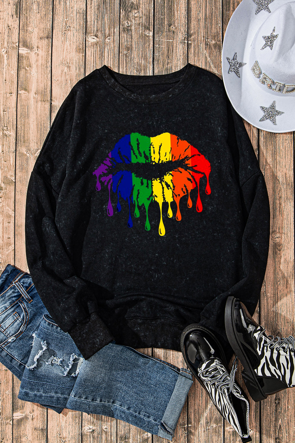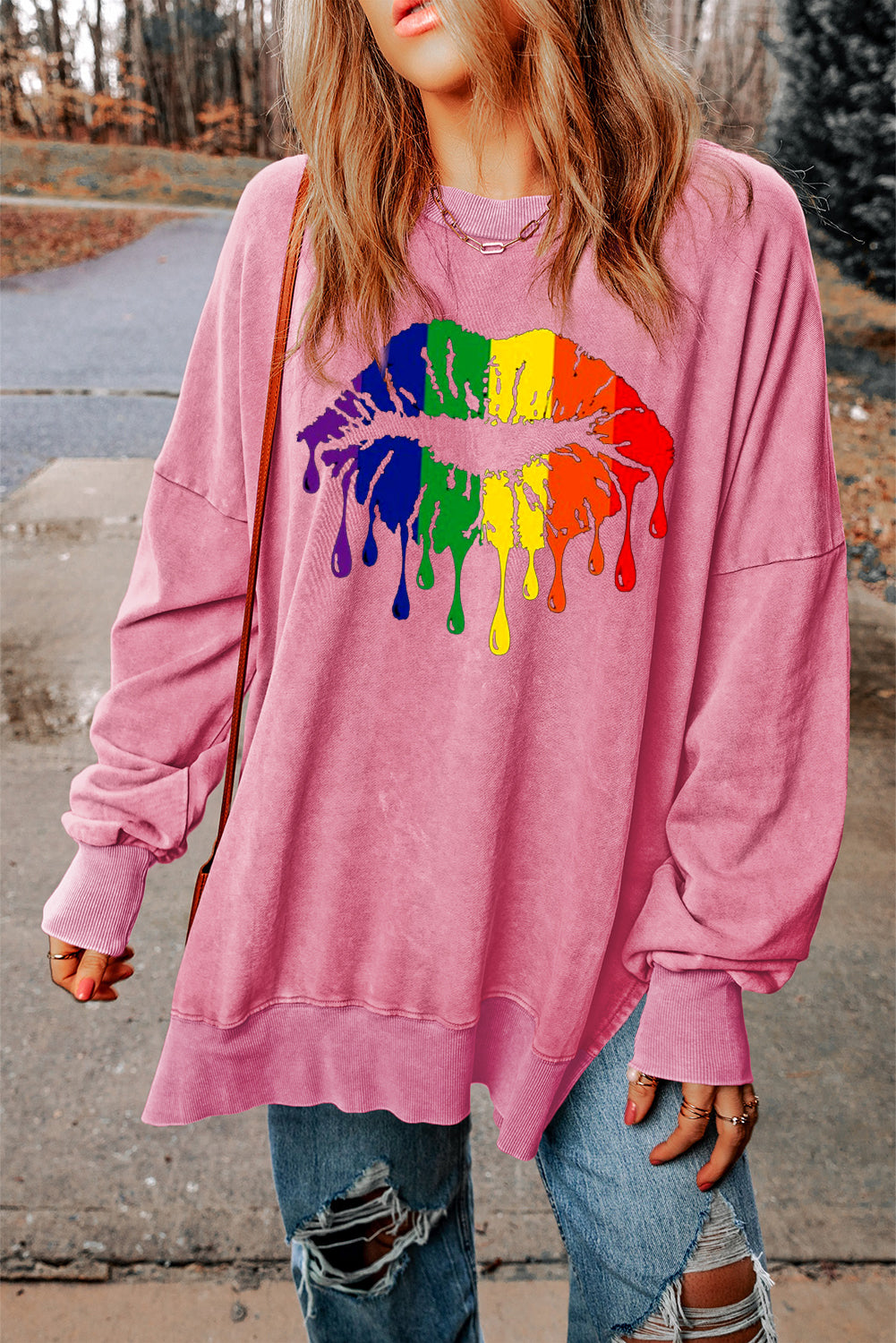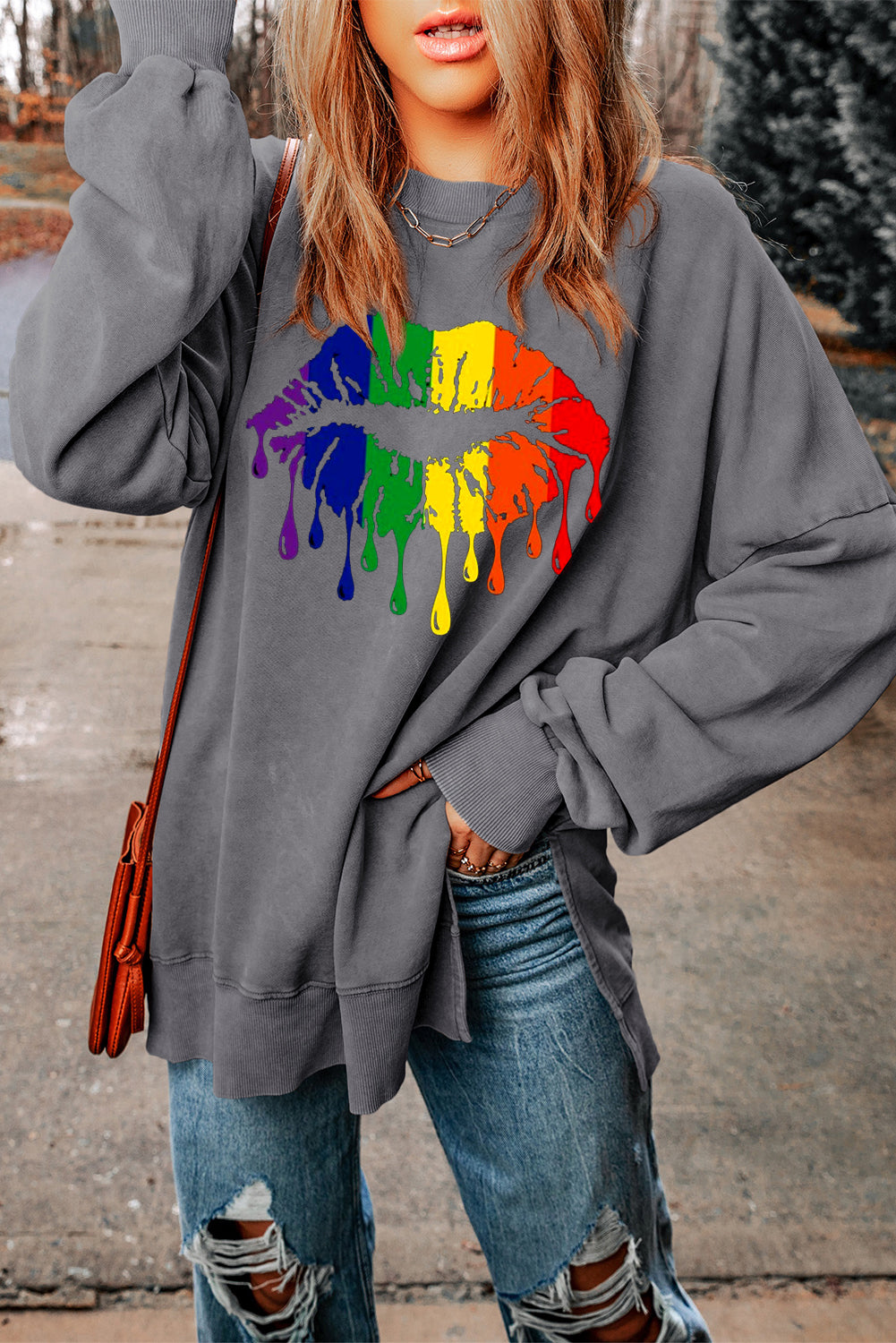 Make a statement with the vibrant rainbow lip print on the front of this cozy sweatshirt. A fun and colorful design that adds an energetic touch to any casual outfit.