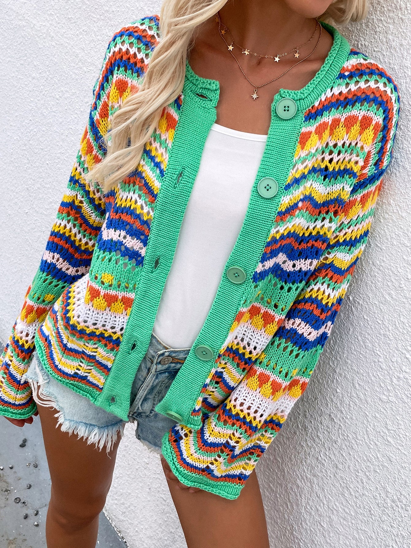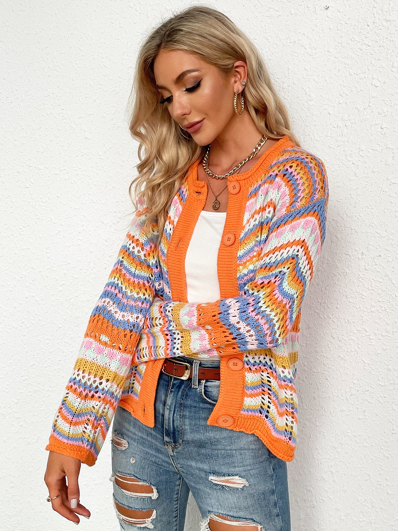 Features: Classic Crew Neck Design, Long Sleeves, Single Breasted, Colorful Stripe Print Pattern, Open Knit, Eyelets, Sheer, Loose Fit, Women's Fashion Sweater Cardigan, Casual Colorblock Knit Jacket.