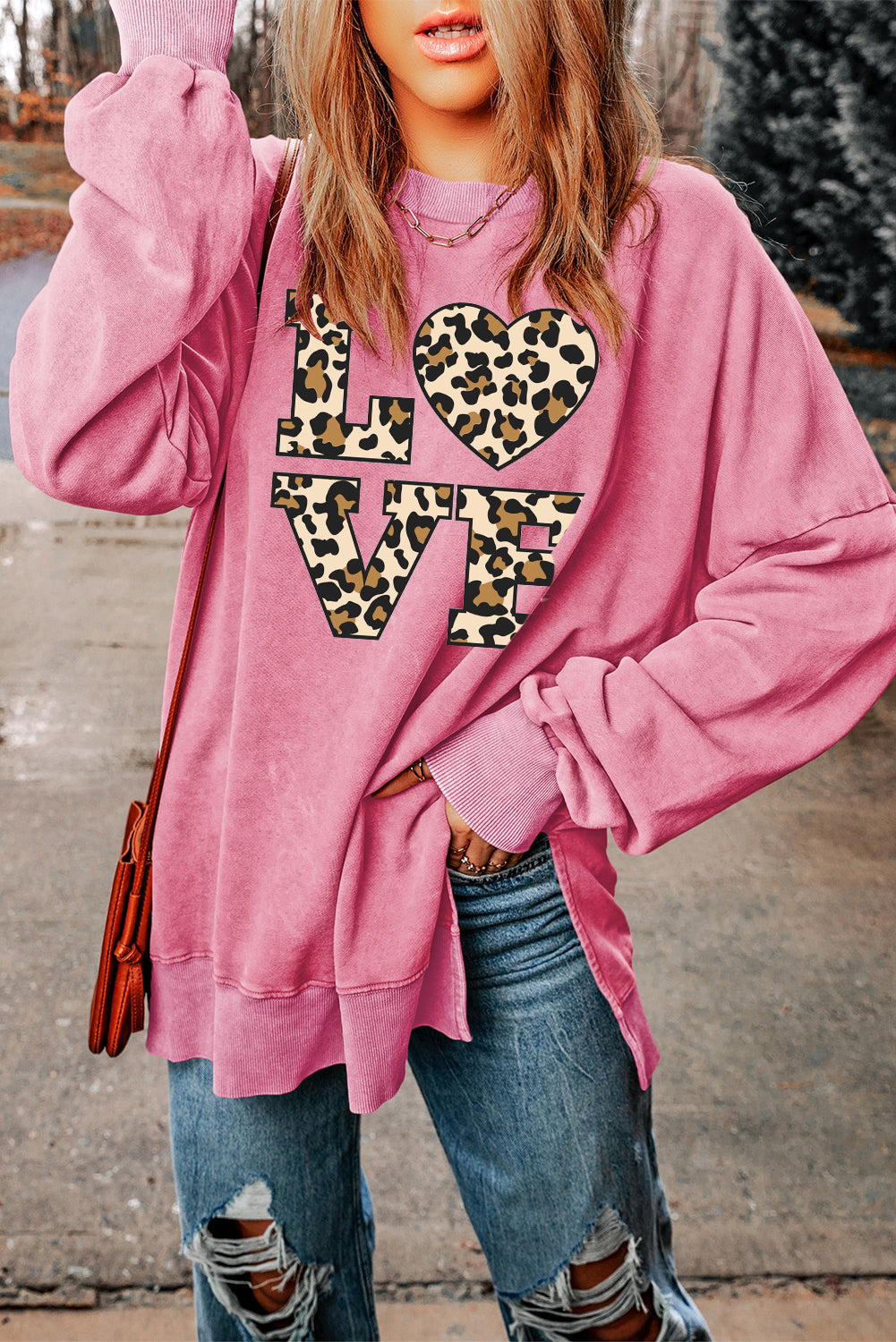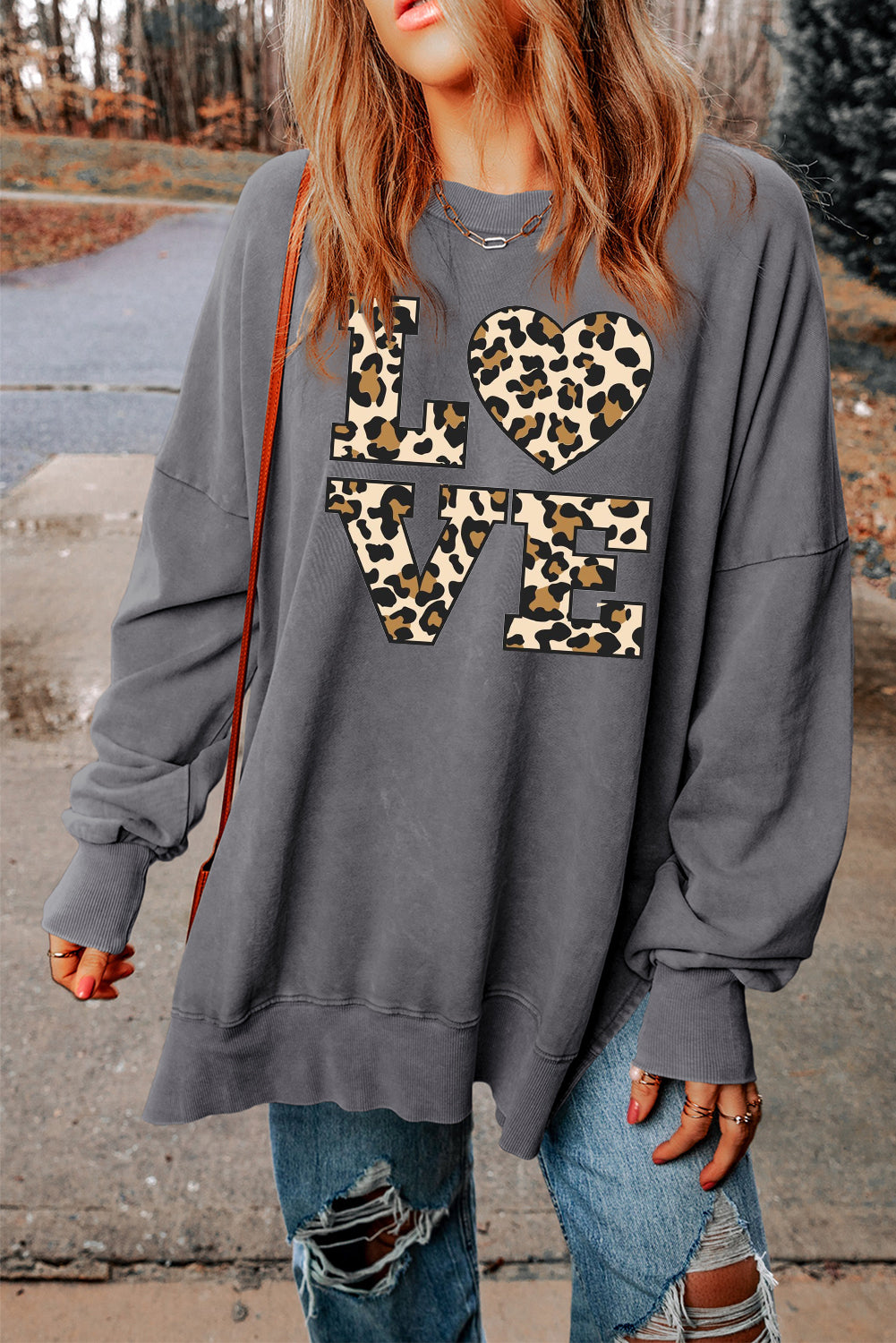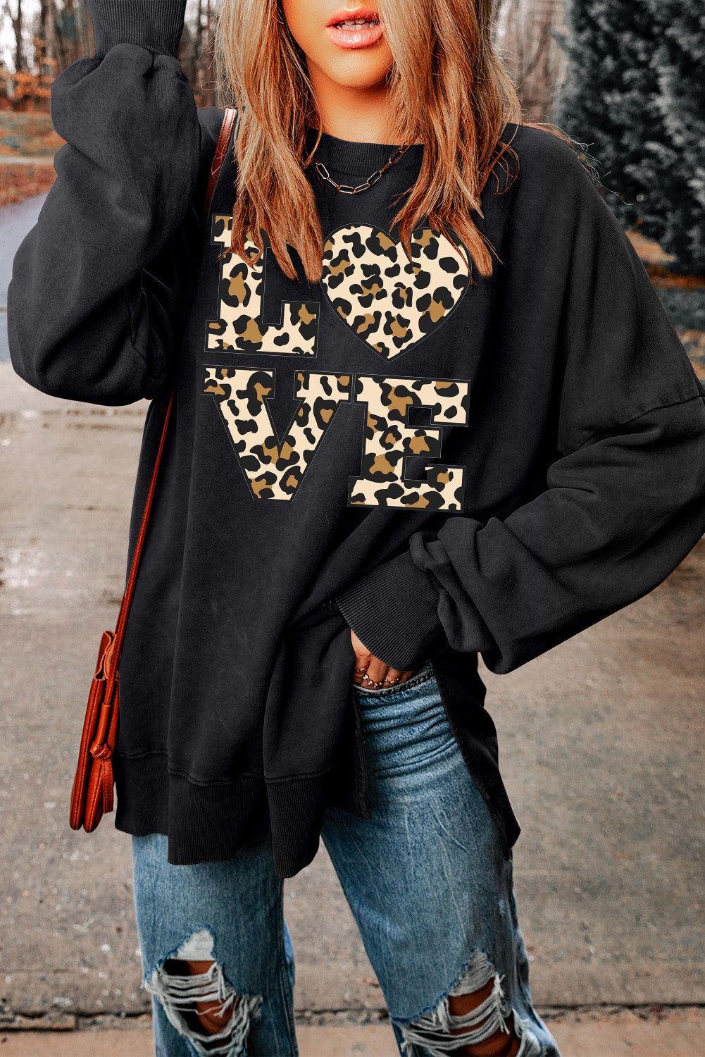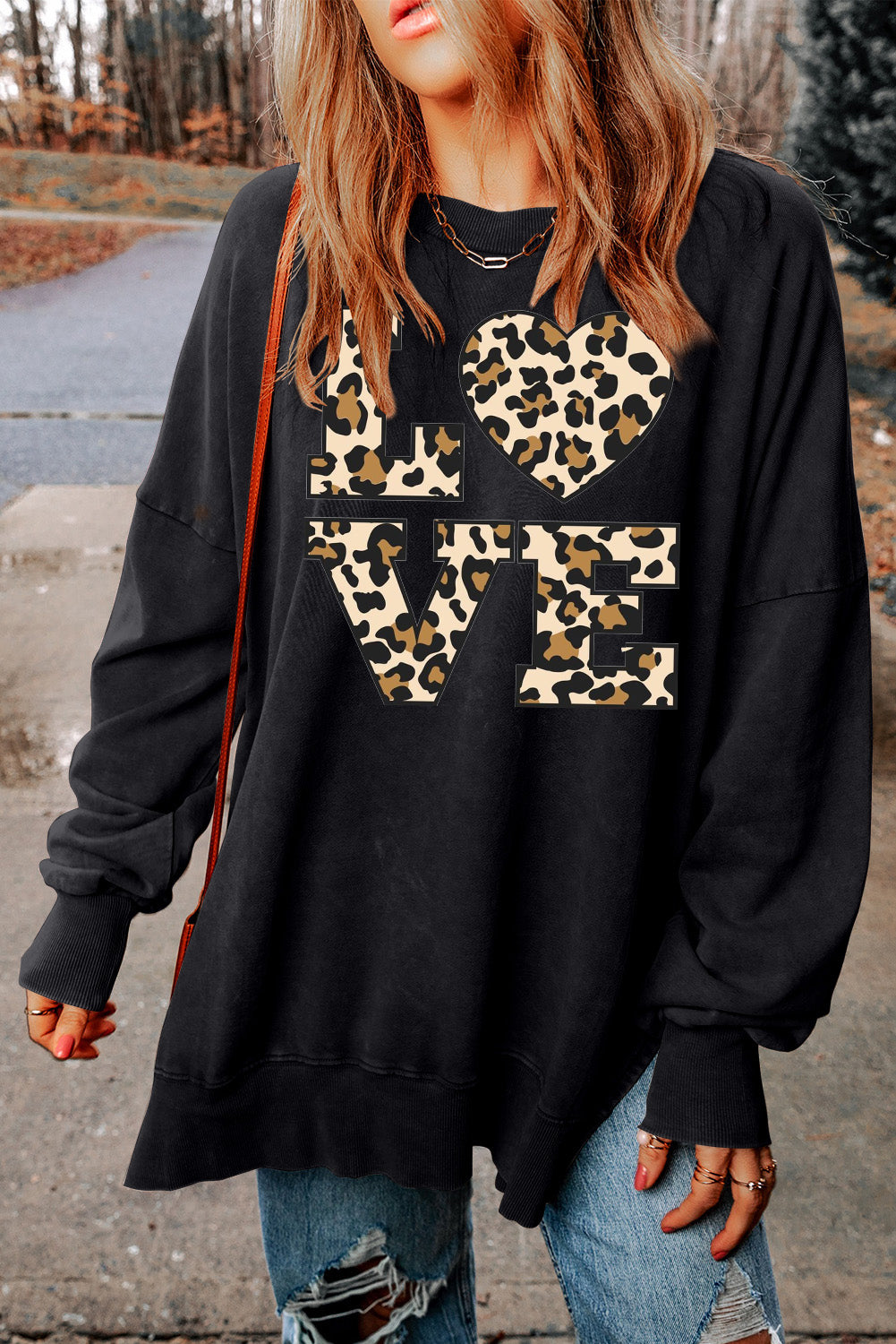 Date Night Leopard Print Heart Oversized Drop Shoulder Ribbed Sweatshirt