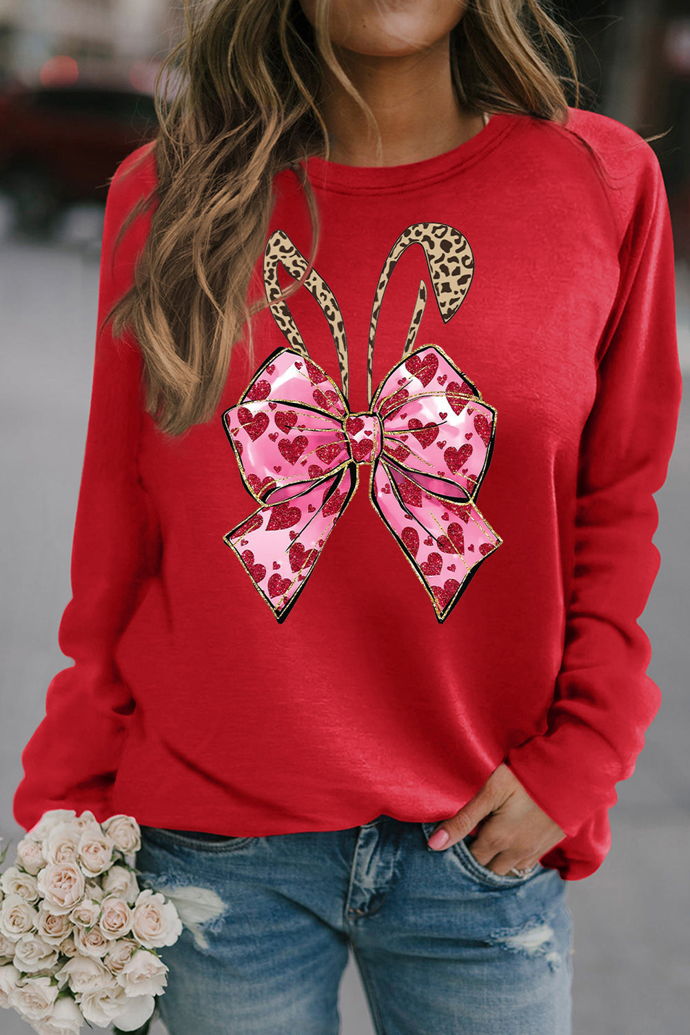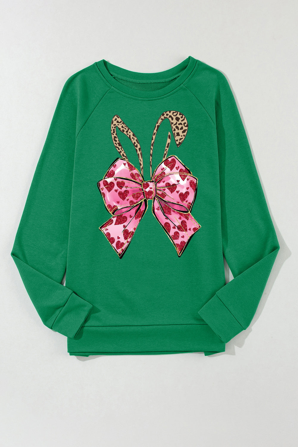 Easter Bunny Bow Pattern Solid Crew Neck Raglan Sleeve Sweatshirt