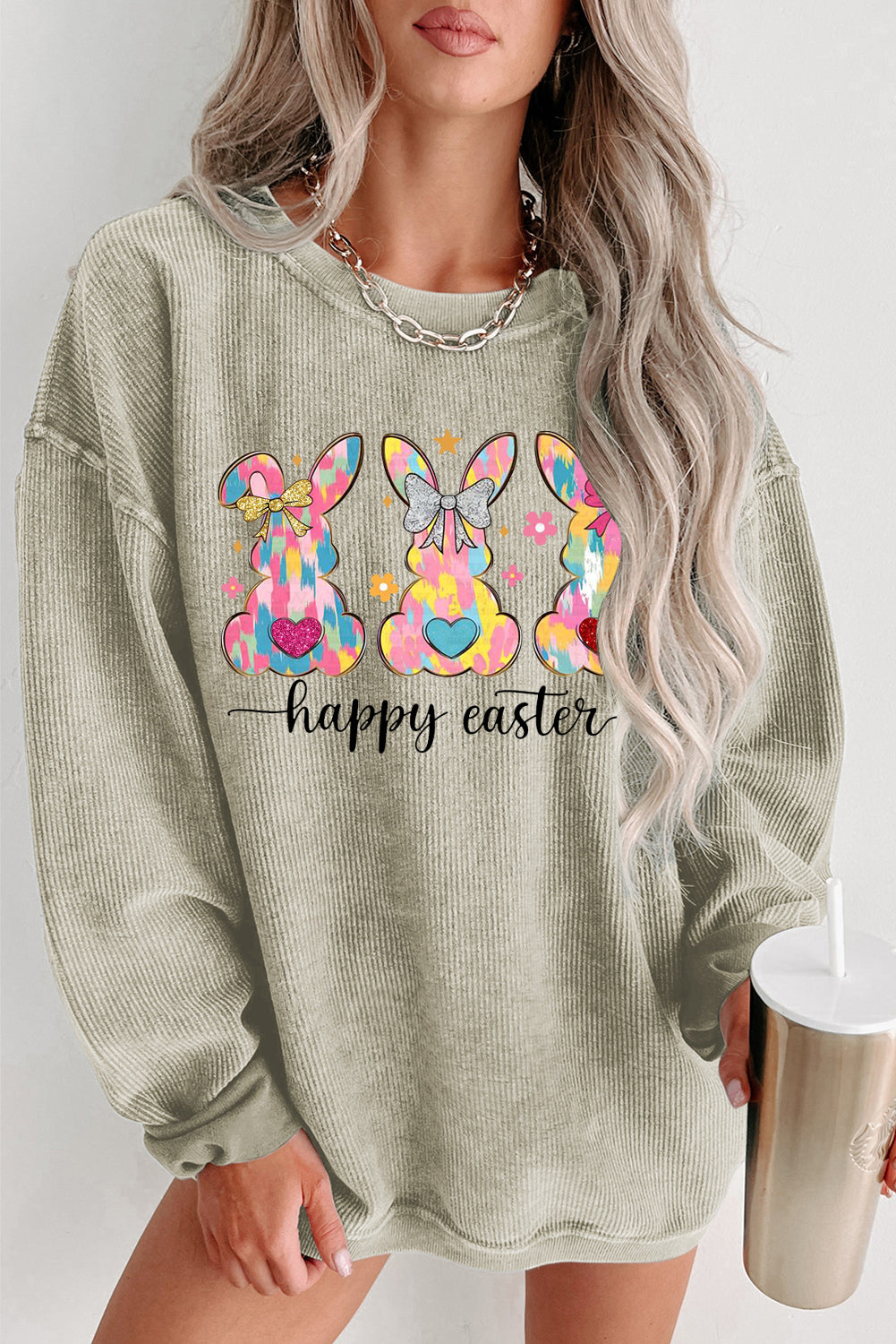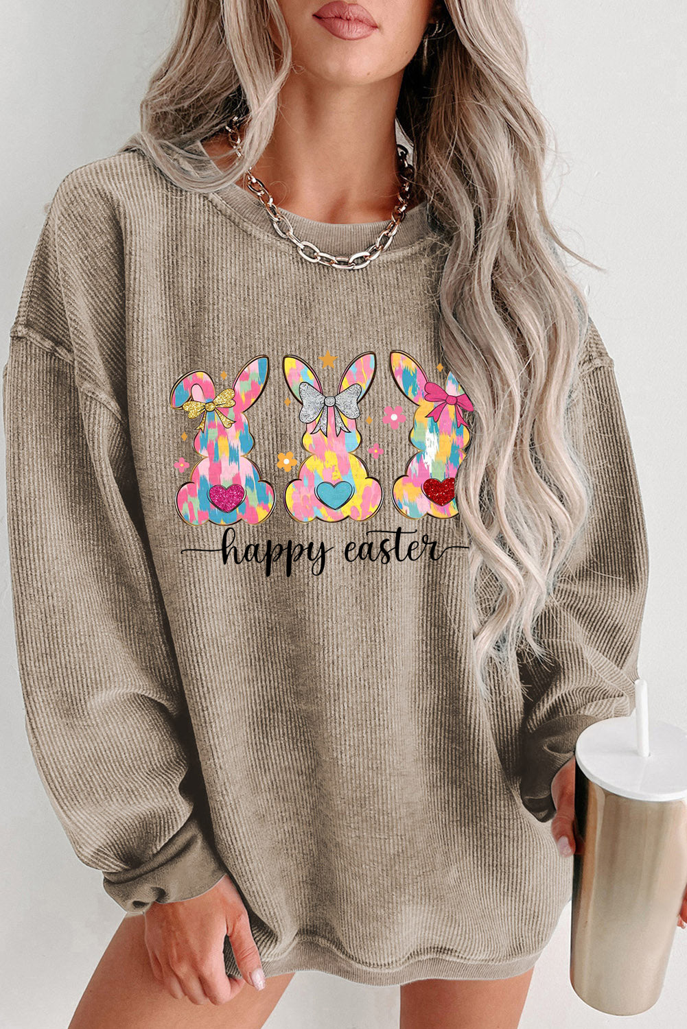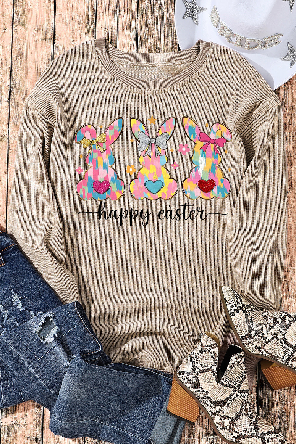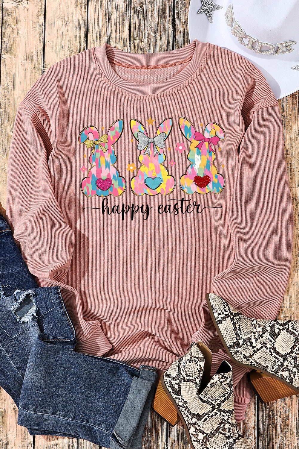 Easter Bunny Ribbed Knit Round Neck Pullover Sweatshirt