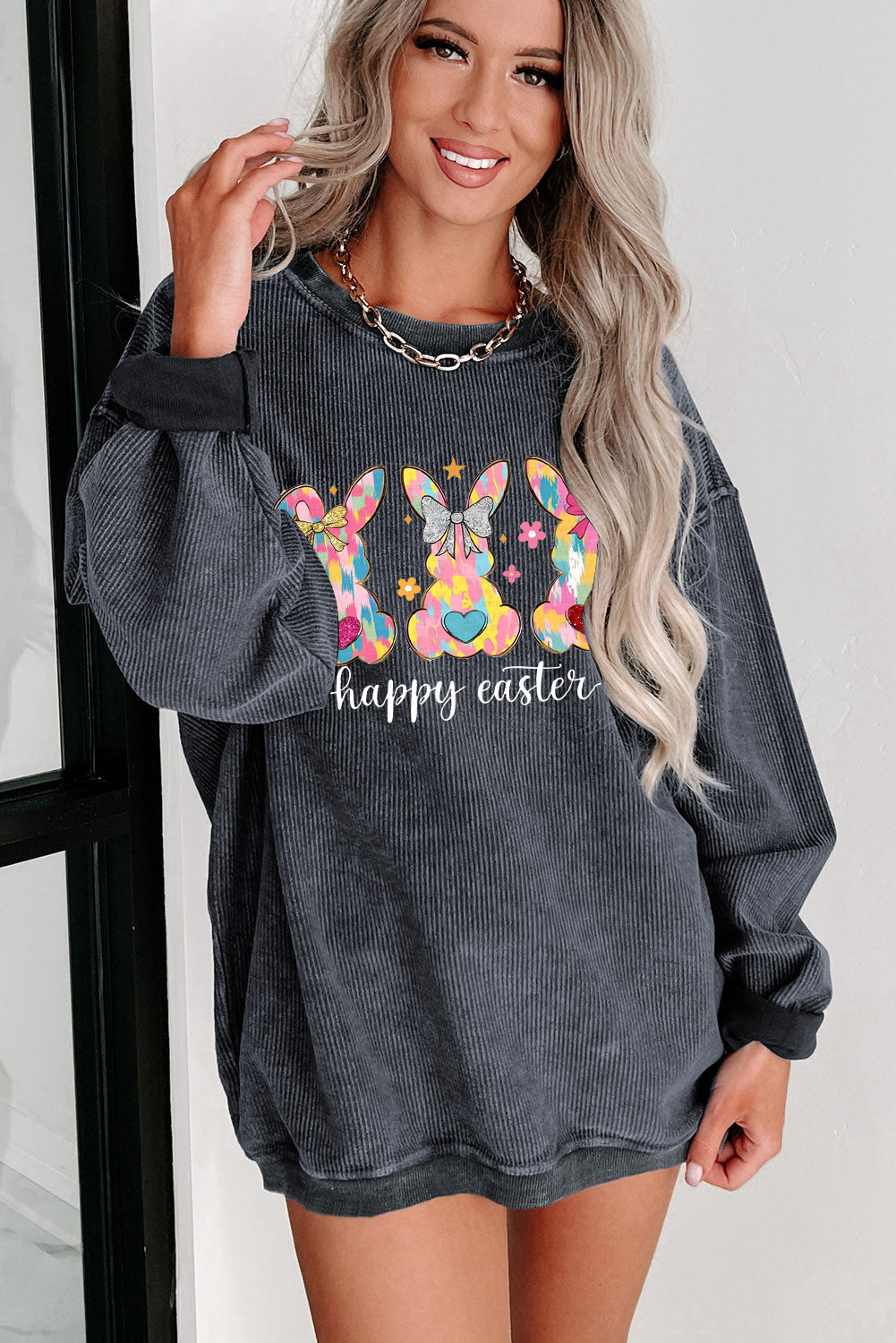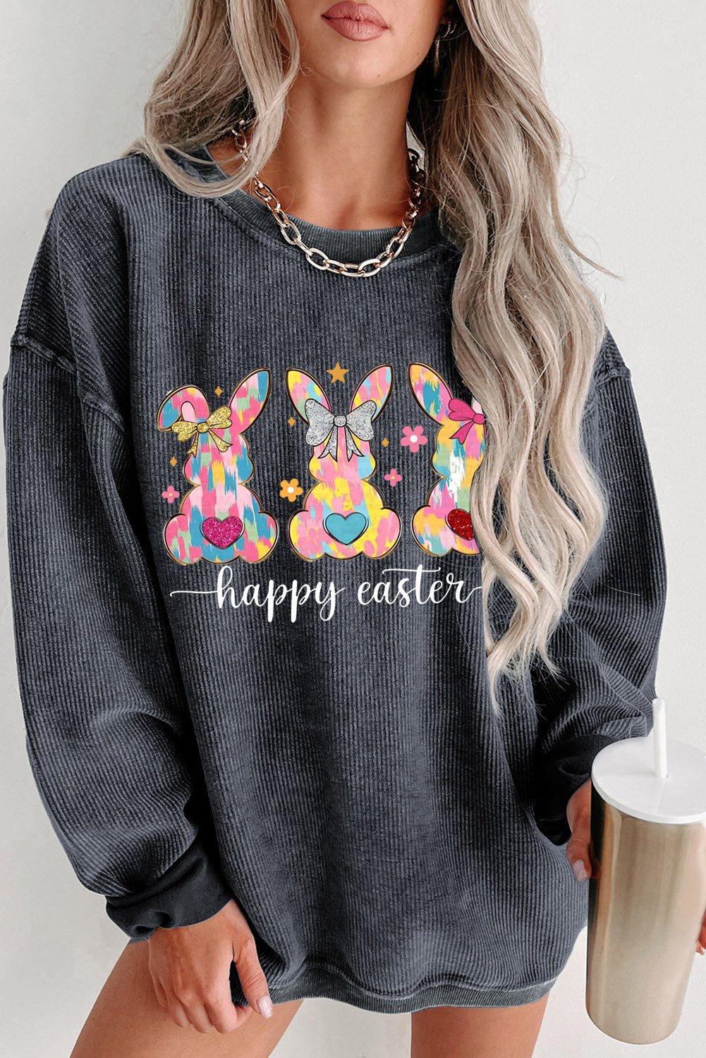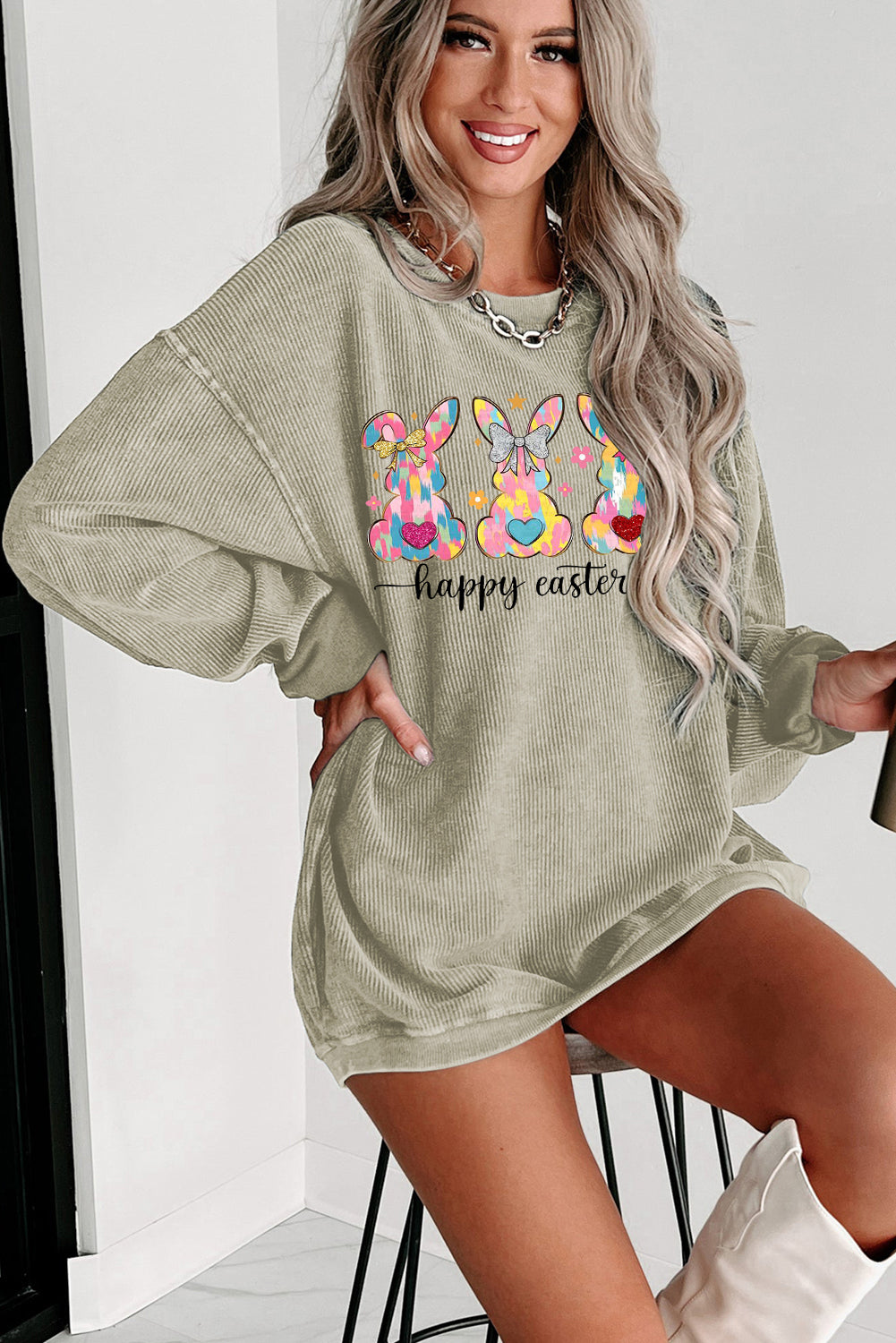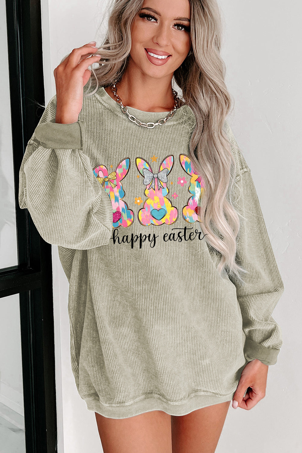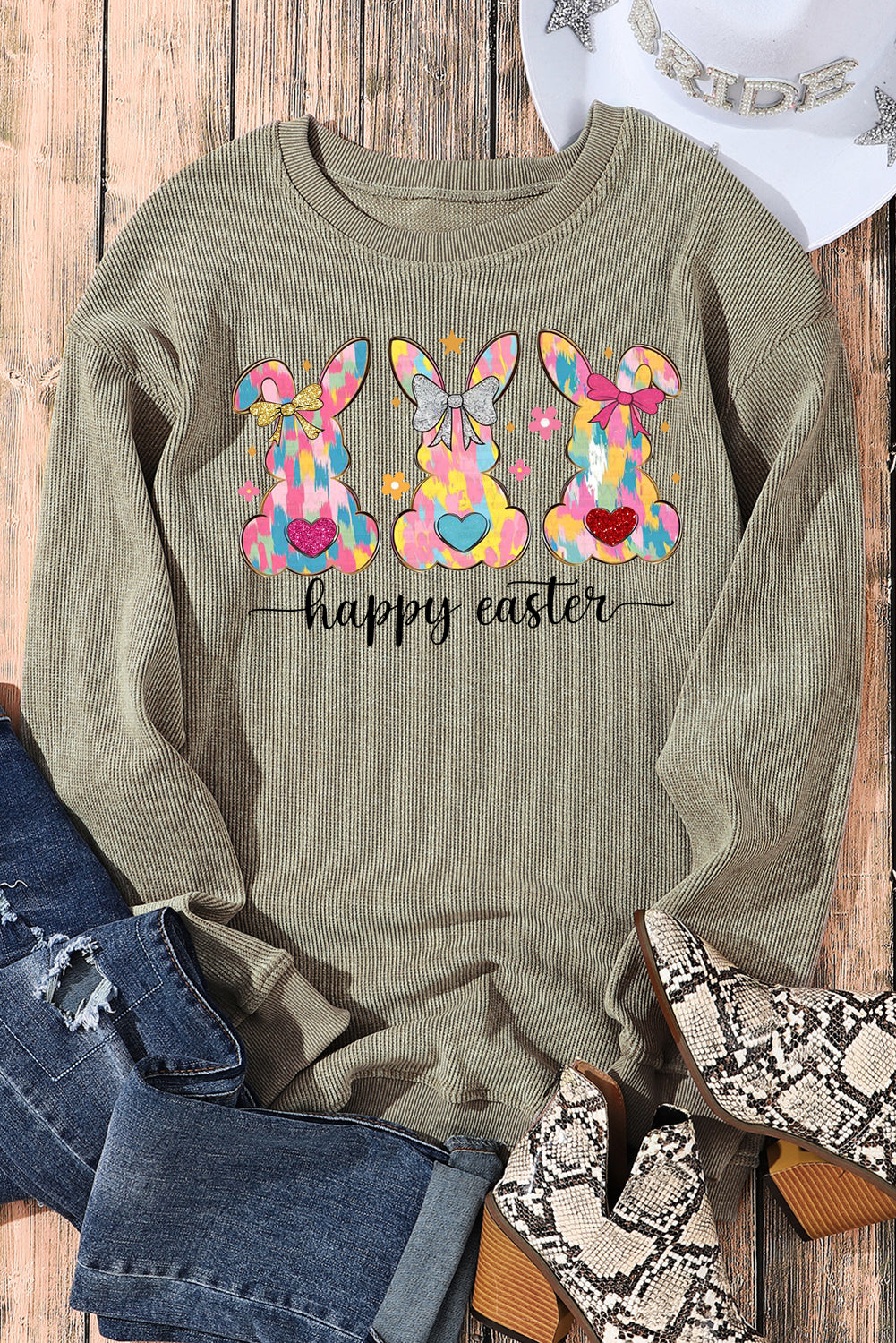Easter Bunny Ribbed Knit Round Neck Pullover Sweatshirt