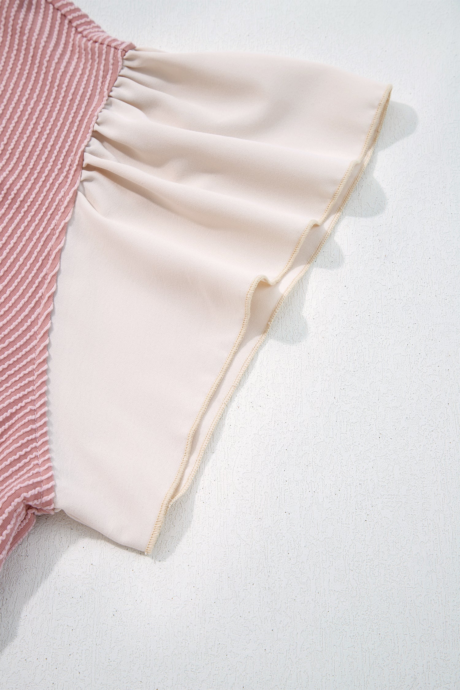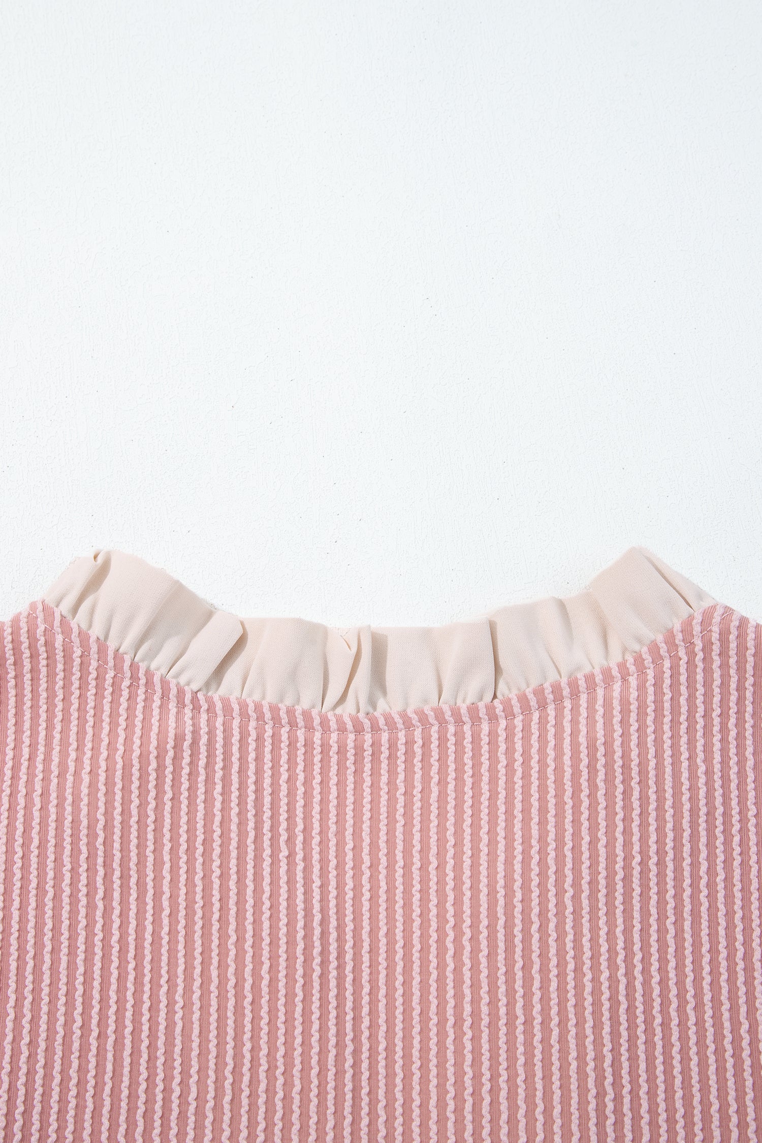 Fushia Plus Size Contrast Frilled Neckline Ruffled Short Sleeve Ribbed Textured Blouse