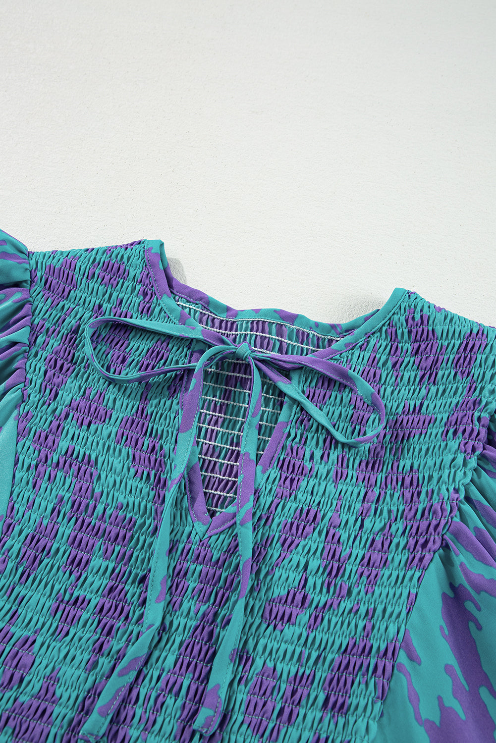 Green Abstract Print Puff Sleeve Tied Notched Neck Long Dress